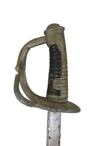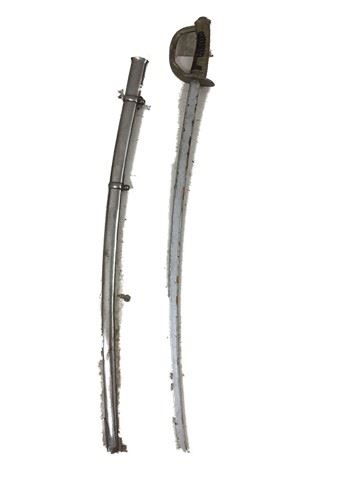 Mutiny on the Bounty (1962) - Calvary saber prop swords. Silver sheeth is made of metal with two belt loop rings. Blade is made of metal wrapped with leather painted silver. Hilt is made of metal painted gold with a black leather grip and gold detail. (measures 42" long)