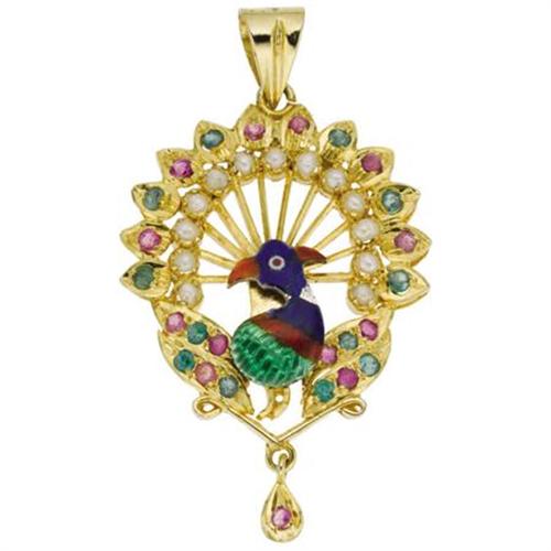 <B>Ruby, Emerald, Cultured Pearl, Enamel, Gold Pendant</B></I><BR><BR>The pendant, designed as a peacock, features round-cut rubies weighing a total of approximately 0.60 carat, alternating with round-cut emeralds weighing a total of approximately 0.48 carat, further enhanced by cultured pearls measuring 2.50 - 2.00 mm, accented by blue, orange and green enamel applied on 18k yellow gold. Gross weight 6.80 grams. <BR><I>Dimensions: 2 inches x 1-3/16 inches</B></I><BR><I>*The Property of Sharon Bush</B></I> <B>Condition Report:</B> Good condition.<BR>The enamel is worn and chipping.<BR><BR><BR><b>Shipping:</b> Miscellaneous Collectibles, Smal (<a target="_blank" href="http://www.heritageauctions.com/common/shipping.php">view shipping information</a>)