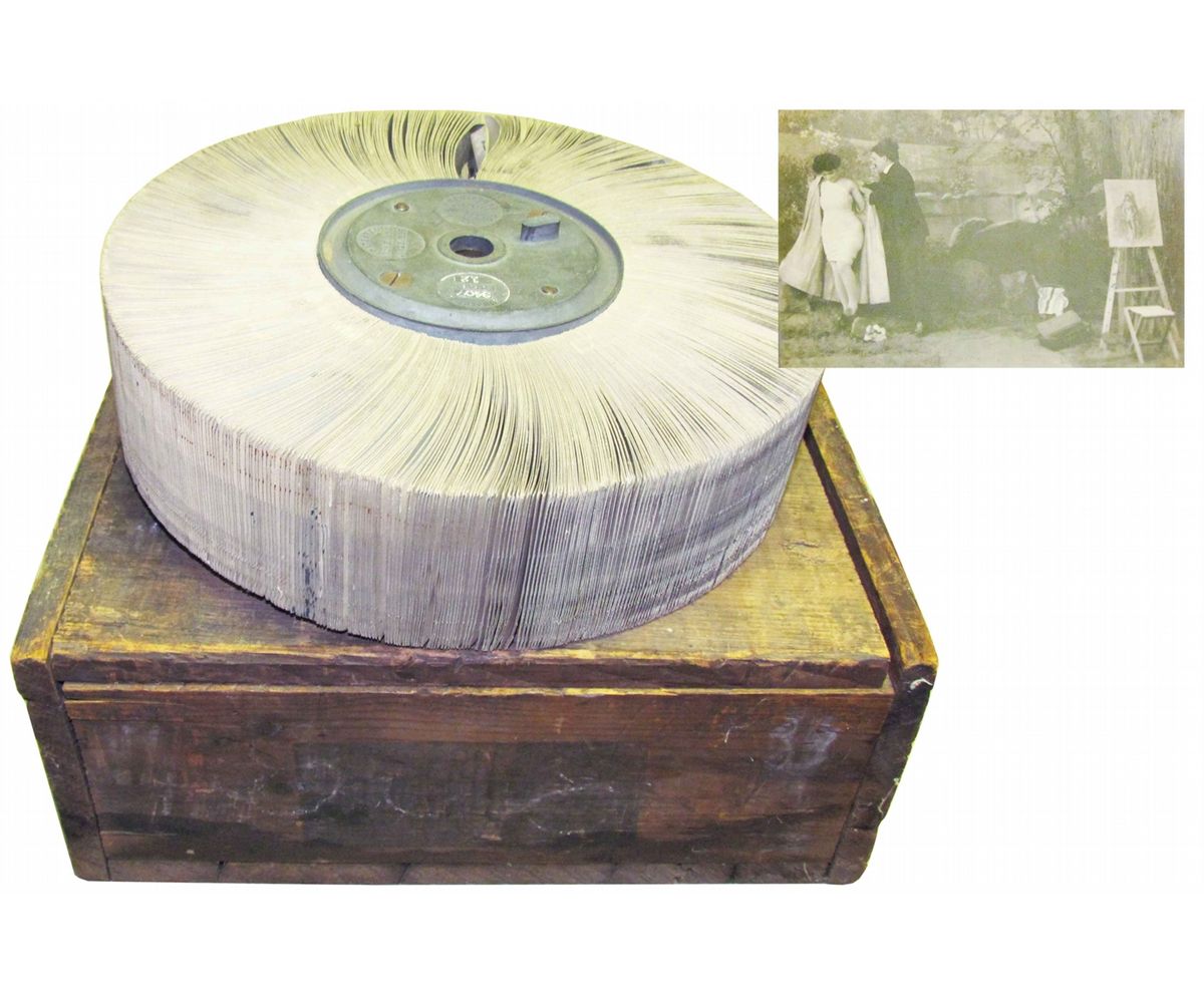 Mutoscope Reel "Artist". Depicting man painting woman in her under garments. Subject # 3407. Serial # 12. American Mutoscope & Biographic Co. makers. Comes in original wood crate, some damaged cards otherwise good condition.