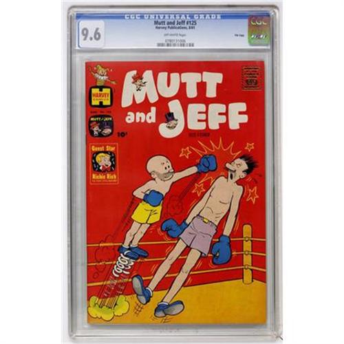 <B>Mutt and Jeff #125 File Copy (Harvey, 1961) CGC NM+ 9.6 Off-white pages.</B></I> Richie Rich appearance. Overstreet 2007 NM- 9.2 value = $55. CGC census 10/07: 1 in 9.6, none higher.<BR><BR><b>Shipping:</b> Comics - Slabbed (certified) (<a target="_blank" href="http://www.heritageauctions.com/common/shipping.php">view shipping information</a>)