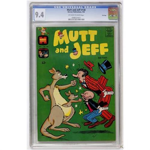 <B>Mutt and Jeff #130 File Copy (Harvey, 1962) CGC NM 9.4 Off-white to white pages.</B></I> Richie Rich appearance. Overstreet 2007 NM- 9.2 value = $55. CGC census 10/07: 1 in 9.4, none higher.<BR><BR><b>Shipping:</b> Comics - Slabbed (certified) (<a target="_blank" href="http://www.heritageauctions.com/common/shipping.php">view shipping information</a>)