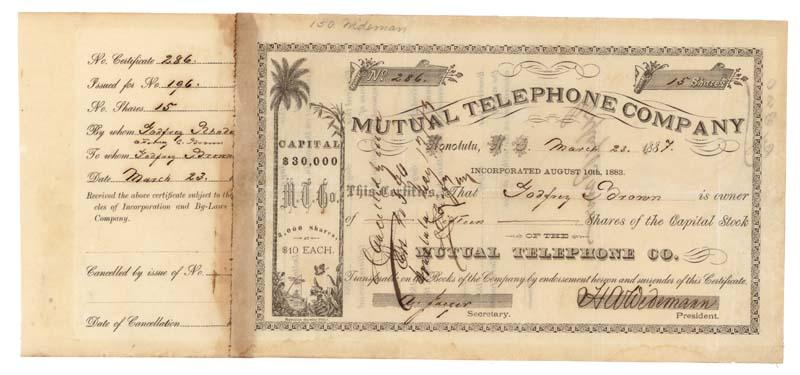 1887. Honolulu, Hawaii. Stock certificate for 15 shares. Black. Vignette of palm trees at left. Litho. Following a period of intense competition with the Hawaiian Bell Telephone Comany, the Mutual bought out Bell in 1894. Nice early, long running Hawaiian telephone company stock. Pen cancelled and very fine.