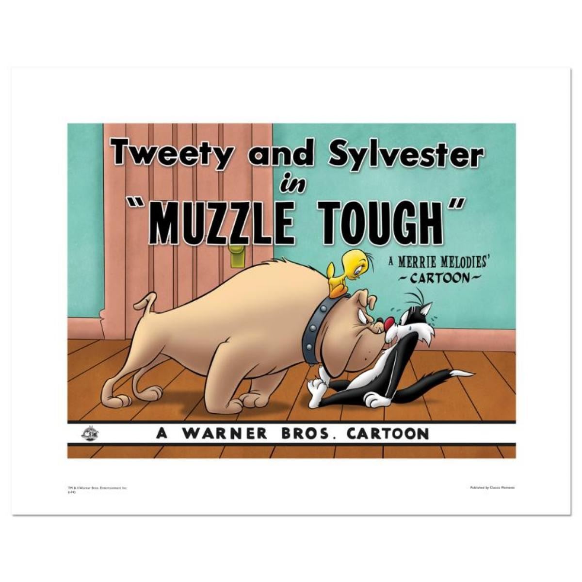 "Muzzle Tough" is a limited edition giclee on paper from Warner Bros. featuring iconic Looney Tunes characters. The art was taken from an original Lobby Card used to promote "Muzzle Tough" directed by Friz Freleng and released in 1954 It comes numbered, with hologram seal, and a Certificate of Authenticity! Measures approx. 20 x 16" (with border), 16" x 12" (image).