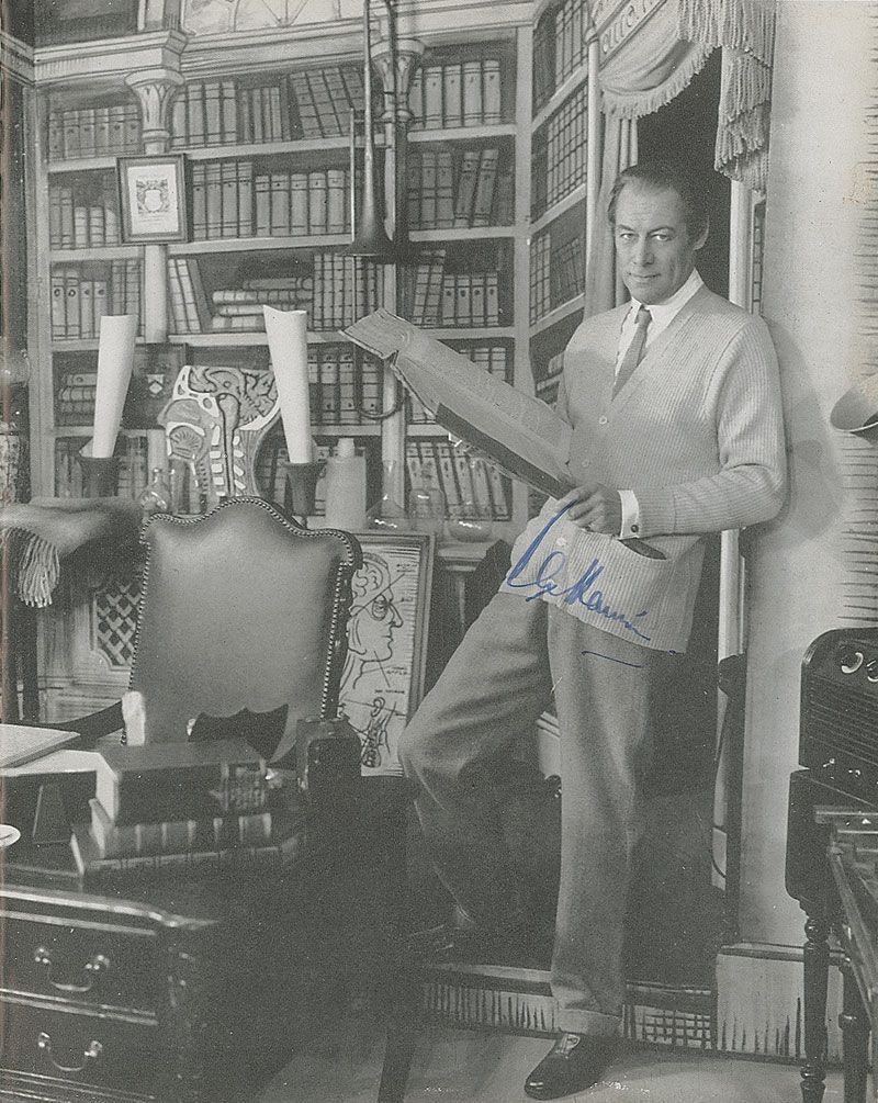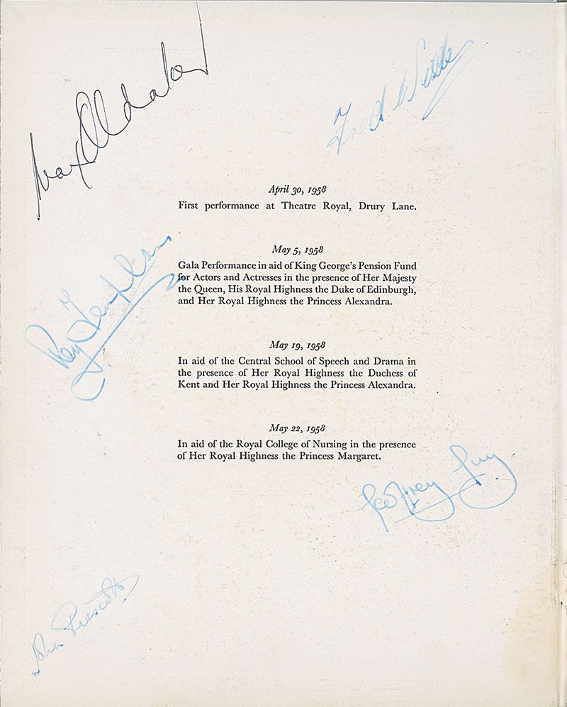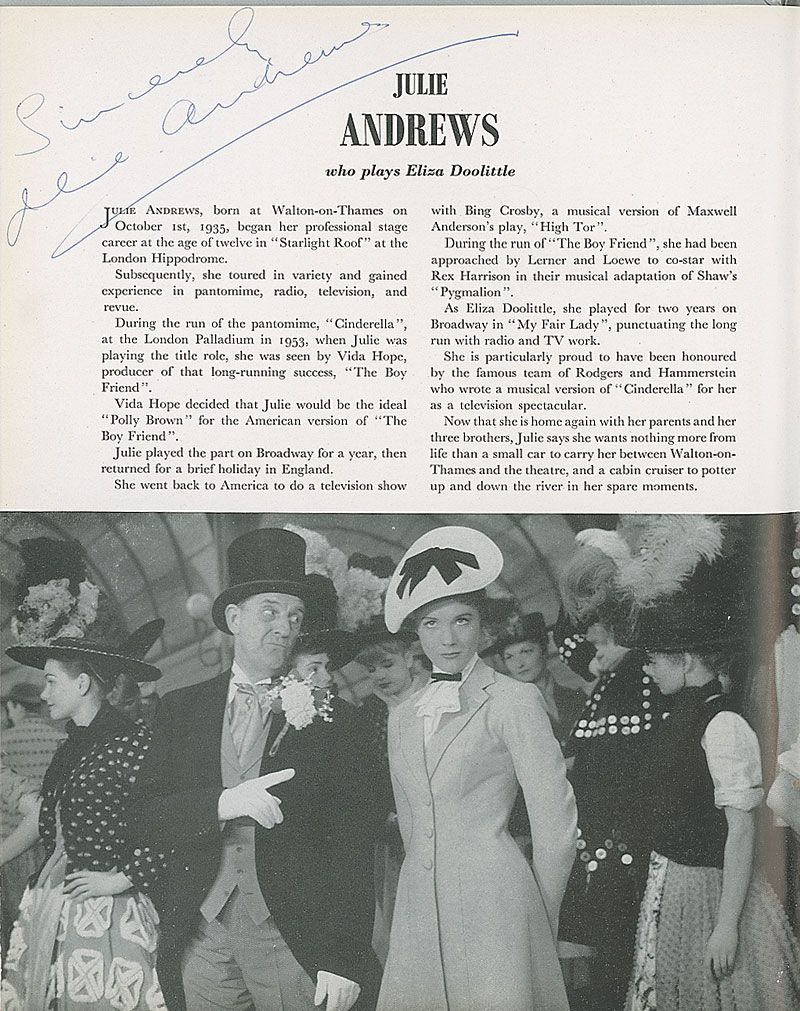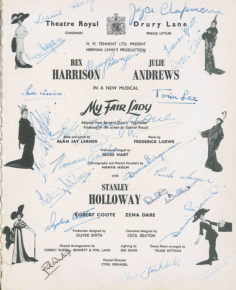 Vintage souvenir book from the performance of My Fair Lady at the Theatre Royal, Drury Lane, London in 1958, 8.5 x 10.75, signed inside and on the pastedowns in fountain pen and ballpoint by 49 cast members. Signers include: Rex Harrison, Julie Andrews, Stanley Holloway, Robert Coote, Zena Dare, Margaret Halstan, and Leonard Weir. In very good condition, with cracked hinges, front cover lightly separated, loose binding and pages, peeling to spine, and some toning to cover. The physical flaws do not affect any of the signatures.