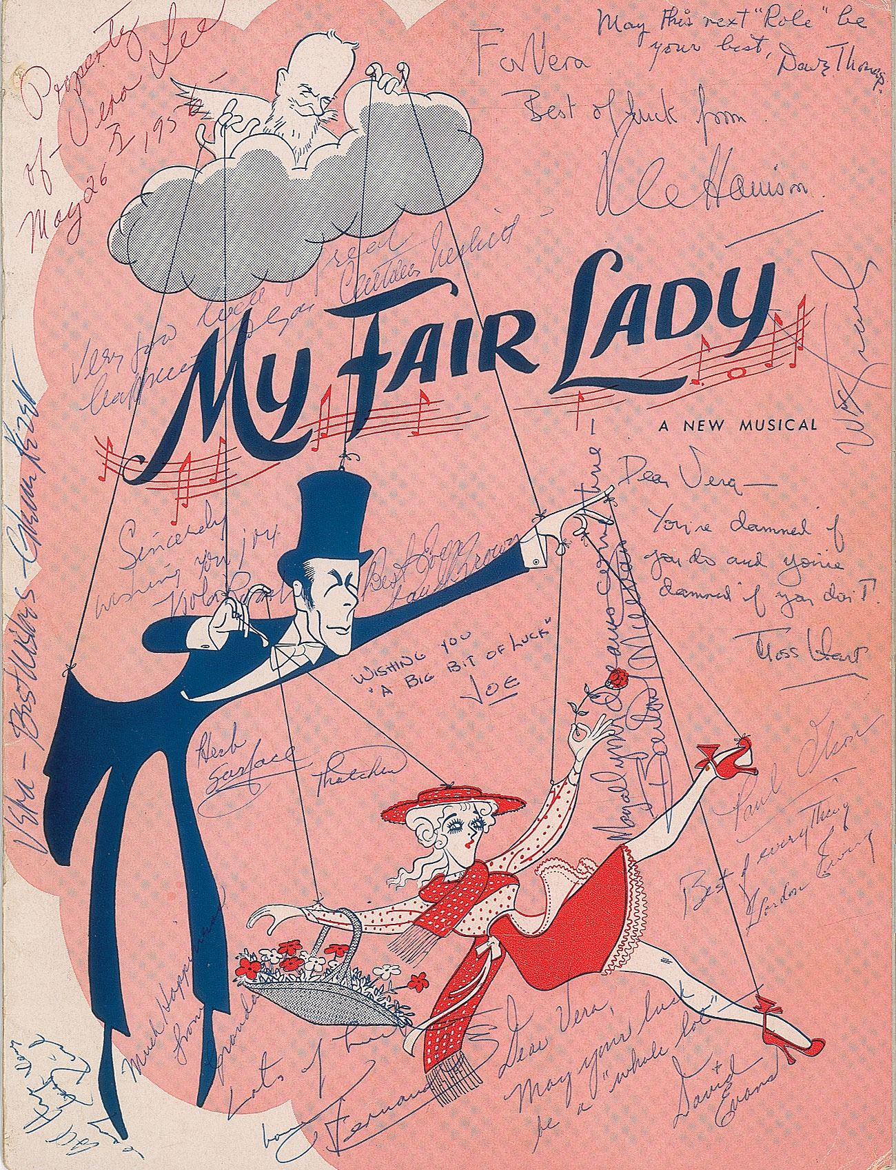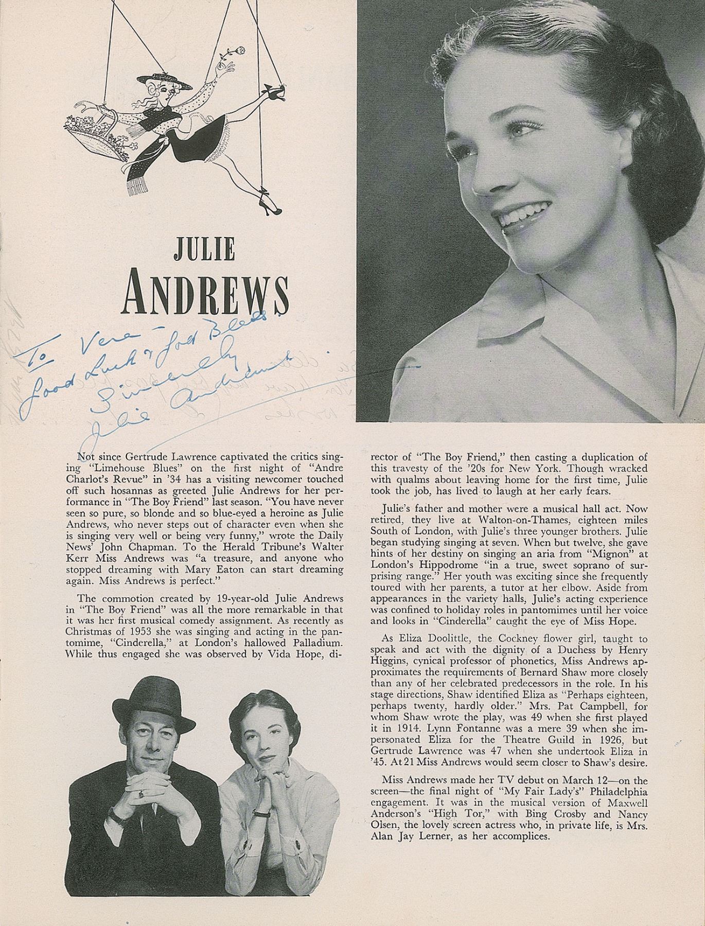 Uncommon original souvenir program for the 1956 musical My Fair Lady, 16 pages, 9 x 11.75, signed and inscribed on the front cover in blue ballpoint, "For Vera, Best of luck from, Rex Harrison," and inside on her bio page in fountain pen, "To Vera—Good luck & God bless, Sincerely, Julie Andrews." The front cover and inner pages are signed by a large assortment of the production's cast and crew, with notables including Stanley Holloway, Cathleen Nesbitt, and playwright Moss Hart. In fine condition, with light handling wear. The consignor notes that "Vera" was a member of the original Broadway cast for My Fair Lady, and hence able to obtain this comprehensively cast-signed program.