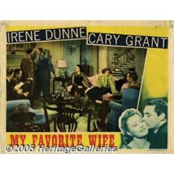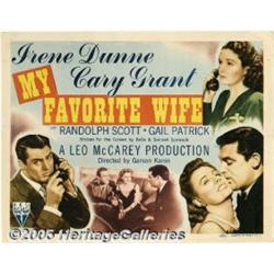 <B>My Favorite Wife (RKO, 1940)</B></I> Title Lobby Card and Scene Card (11" X 14"). Cary Grant and Irene Dunne are at the height of their comedic powers in this screwball film from director Garson Kanin and producer Leo McCarey. Ellen Wagstaff Arden (Dunne) has been marooned for seven years on a tropical island with handsome hunk Stephen Burkett (Randolph Scott), calling each other "Adam" and "Eve". Her husband Nick (Grant), thinking her dead, has remarried to Bianca Bates (Gail Patrick). When Ellen shows up at Nick's honeymoon, complications and hilarity ensue. Remade in 1963 as "Move Over, Darling" with Doris Day and James Garner. Pinholes, slight corner wear, slight toning and one small tear in Grant's name on this gorgeous title card from this classic comedy. It would grade as Very Fine. The scene card has scuffs and soiling. It grades as Very Good/Fine. 2 items
