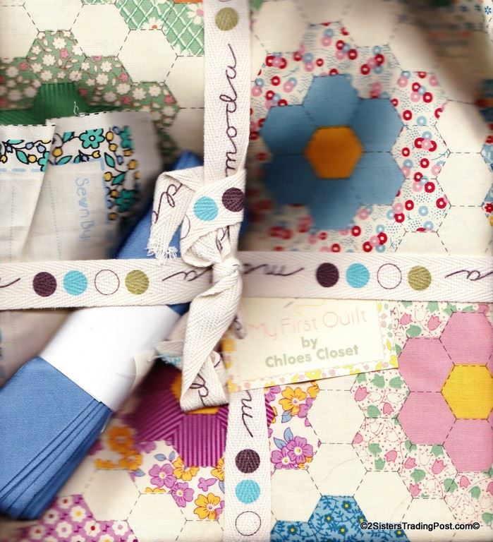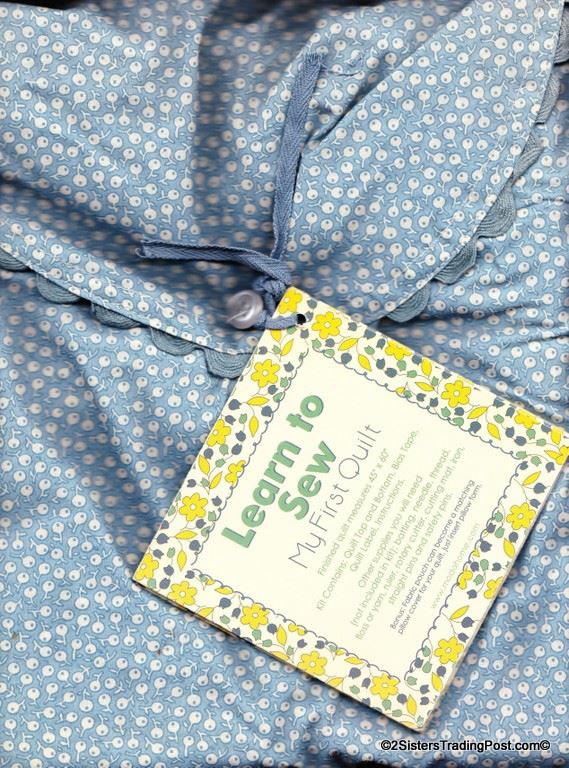 Kit 963-43 comes complete in a cloth bag 'Learn to Sew My First Quilt' designed by moda Home 2009. Kit includes quilt top, bottom, bias tape, quilt label and instructions. Quilt top has flowered quilt pattern and bottom is the blue floral MSRP $37.99