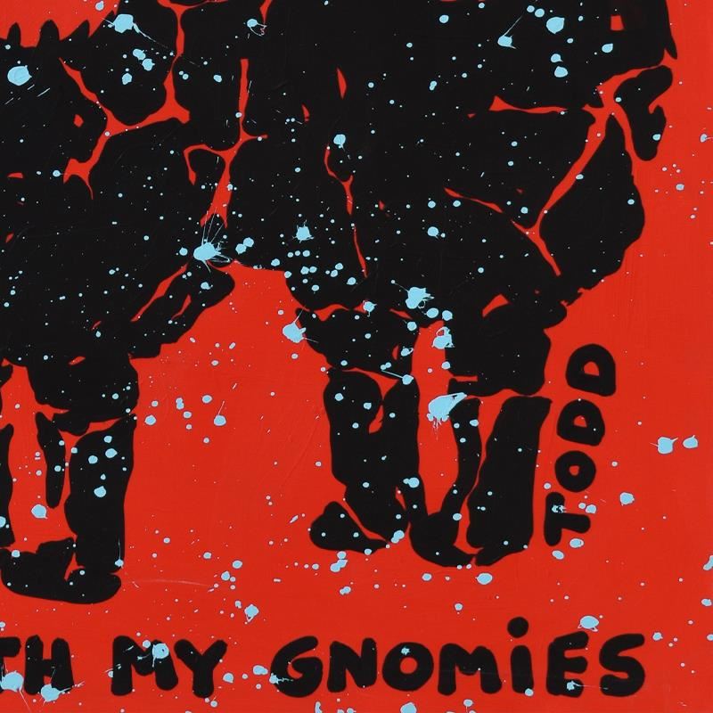 "My Gnomies" is an original acrylic painting on gallery wrapped canvas by Todd Goldman, hand signed by the artist. Includes Letter of Authenticity. Measures approx. 48" x 60" (image). Due to the way this piece was stored there may be minor wear or signs of age (such as wear on the corners) but the piece is in overall good condition.