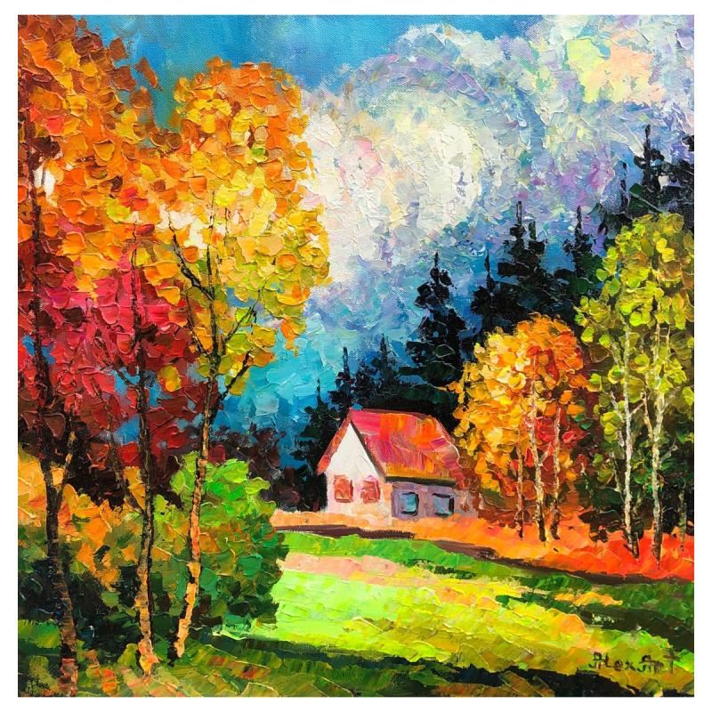 "My Little Home" is an original oil painting on stretched canvas by Alexander Antanenka. Hand signed by the artist, the piece comes with a letter of authenticity. Measures approximately 18" x 18" (image).