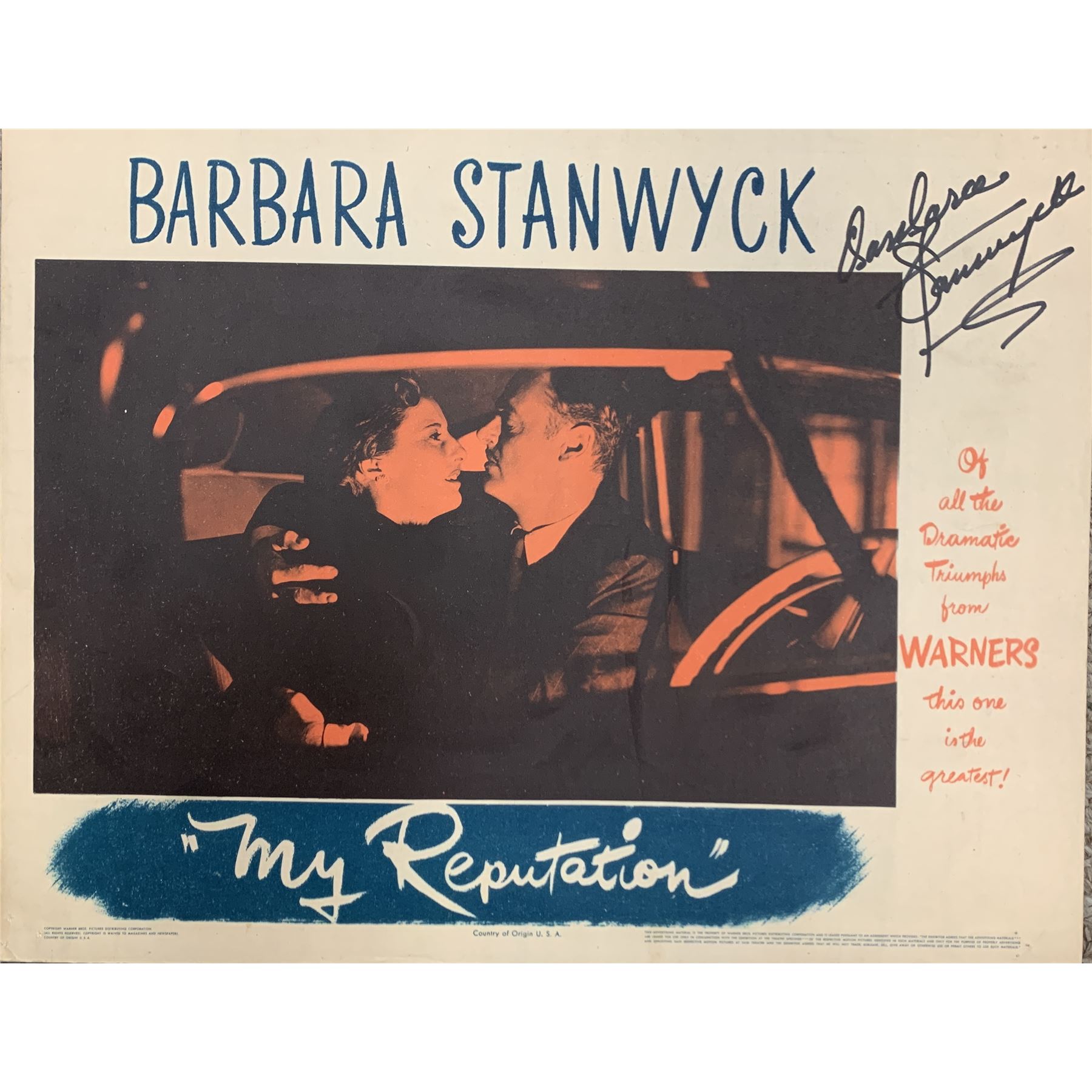 My Reputation Barbara Stanwyck signed Lobby Card. 11x14 inches
