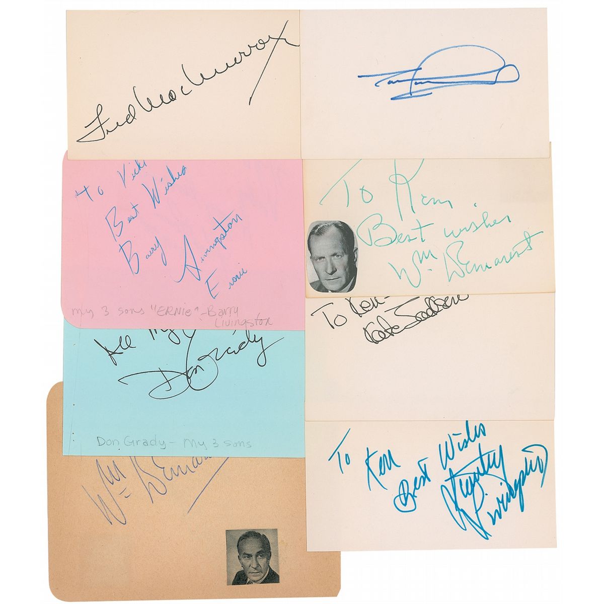 In-person ink and felt tip signatures of Fred MacMurray, William Demarest, Tim Considine, Stanley Livingston, and Barry Livingston on individual off-white 5 x 3 cards, with all but MacMurray inscribing to Ken and ballpoint signatures and inscriptions of William Demarest, Barry Livingston, and Don Grady on individual colored 5.25 x 4 album pages. In fine overall condition.