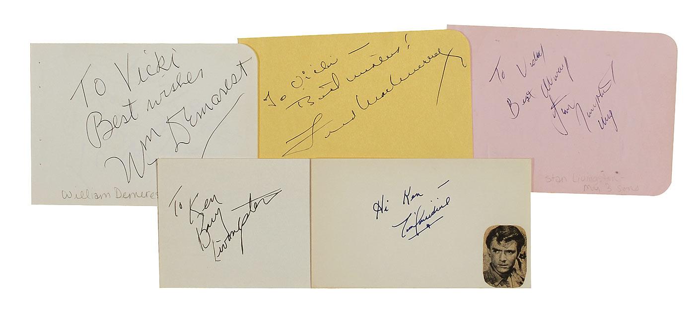 Ink signatures of Fred MacMurray, William Demarest, Tim Considine, Stanley Livingston, and Barry Livingston on individual various colored album pages and off-white cards, with each inscribed to either Ken or Vicki. In overall fine condition, with slight show-through from signatures on opposite sides of album pages.