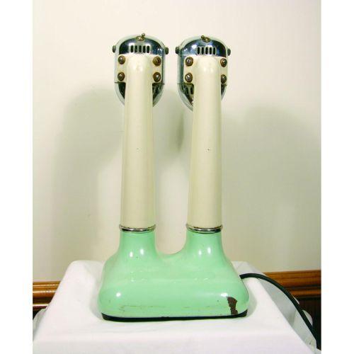 Myers Bullet Malt Mixer, dual stainless with green porcelain base. Chip at bottom right back otherwise very good condition. 9 X 18 X 8 inches.