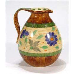 Myott Art Deco jug, hand painted with a band of flowers onto a brown ground, marks to base, 20cm high