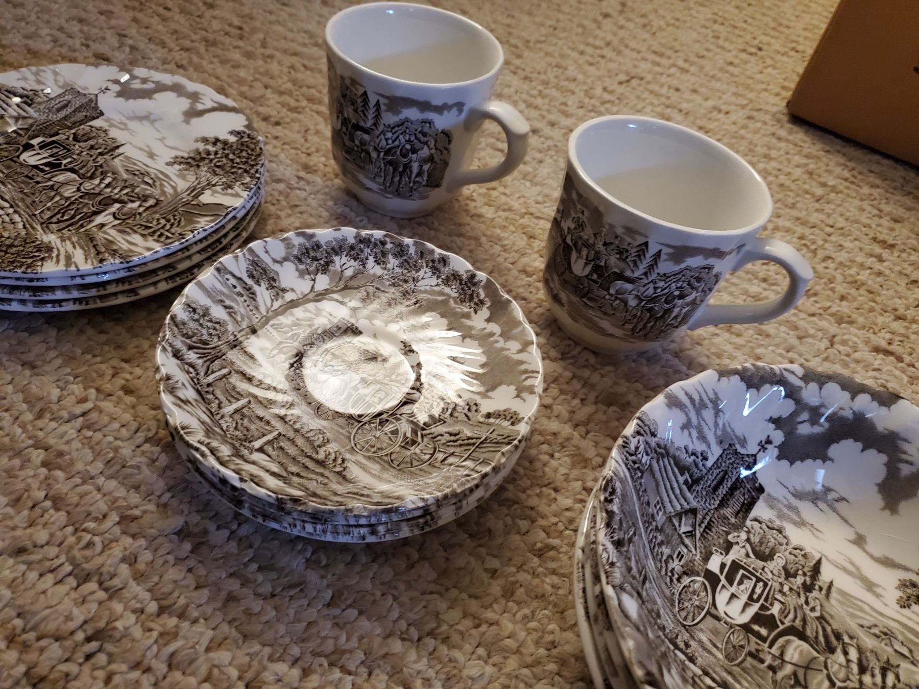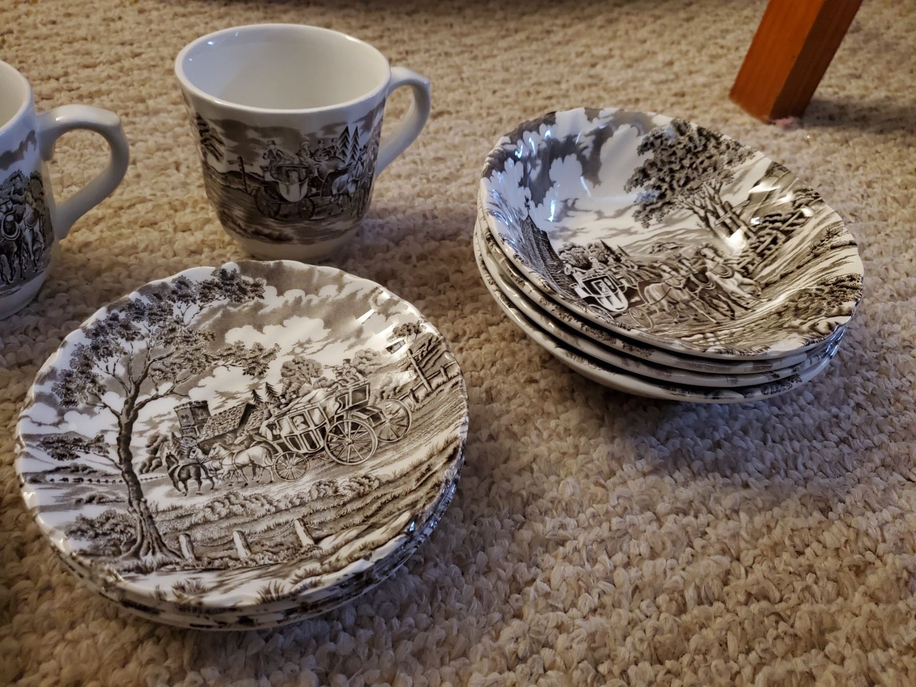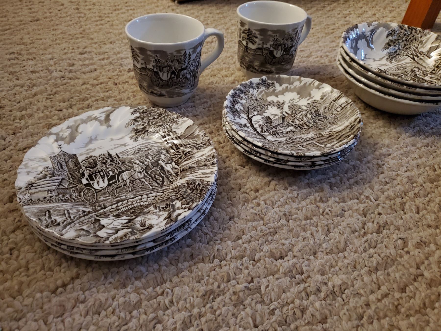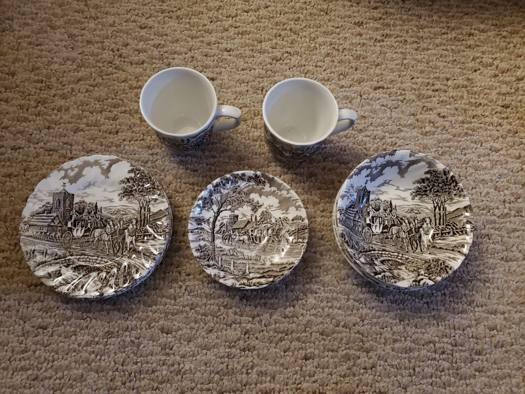 4 bowls, 4 saucers, 4 dessert plates, 2 cups