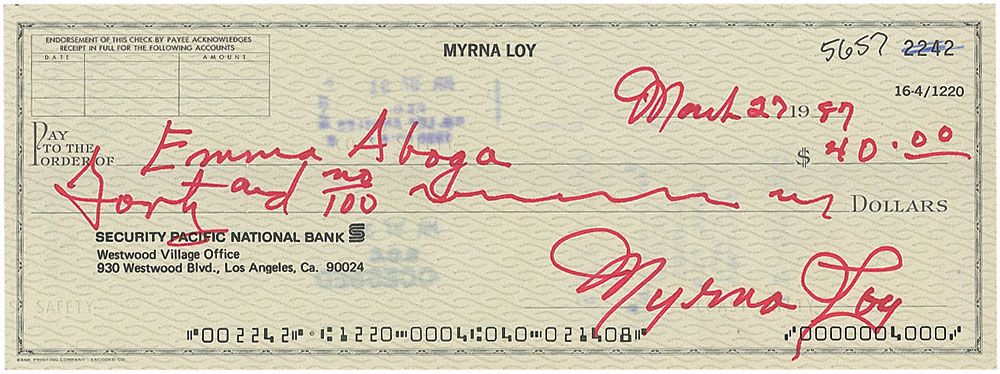 Personal check, 8.25 x 3, filled out and signed by Loy, payable to Emma Aboga for $40.00, March 27, 1987. In fine condition, with three vertical folds, one through a single letter of signature, and show-through from stamps on reverse.