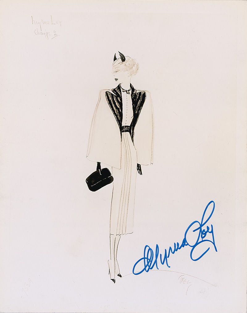 Semi-glossy 8 x 10 cardstock photo of Loy’s outfit in Libeled Lady, signed in blue felt tip. In fine condition, with a few light dings and impressions.