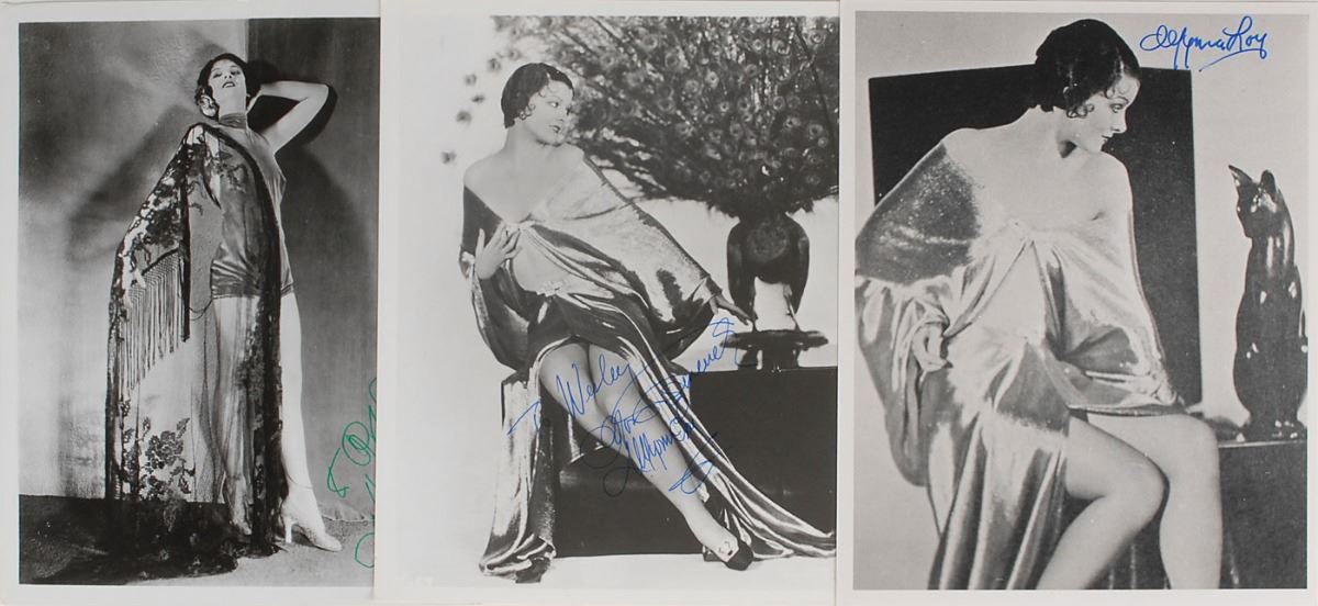 Three glossy 8 x 10 photos of the short-haired beauty, each signed in felt tip by Loy, with two inscribed. In overall very good to fine condition.