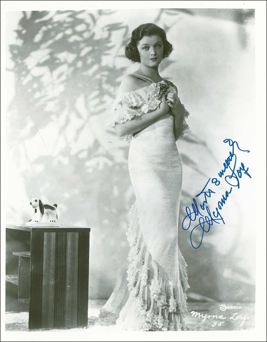 Glossy 8 x 10 full-length photo of Loy in a white gown, signed in blue felt tip, “Most sincerely, Myrna Loy.” In fine condition.