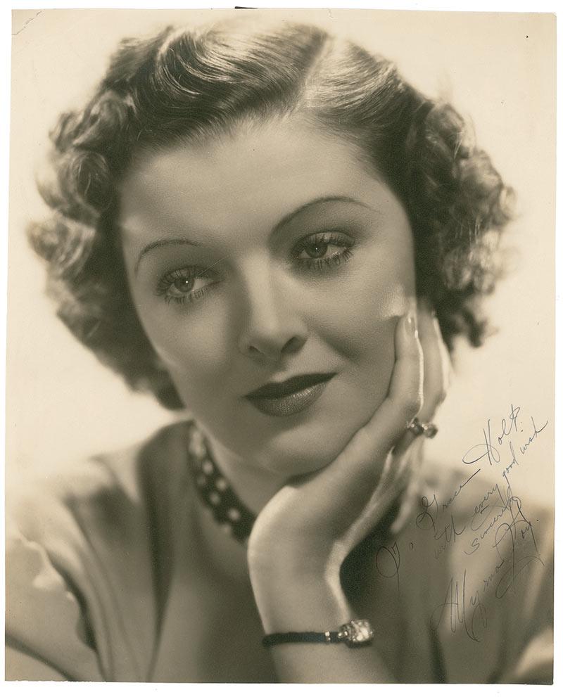 Vintage matte-finish 10.25 x 12.5 photo, signed and inscribed in fountain pen “To Grace Holt, with every good wish, sincerely, Myrna Loy.” In very good condition, with lightly trimmed edges, a few corner creases, a bit of light silvering, and a noticeable central vertical crease. The signature remains crisp and unaffected by any of the flaws.