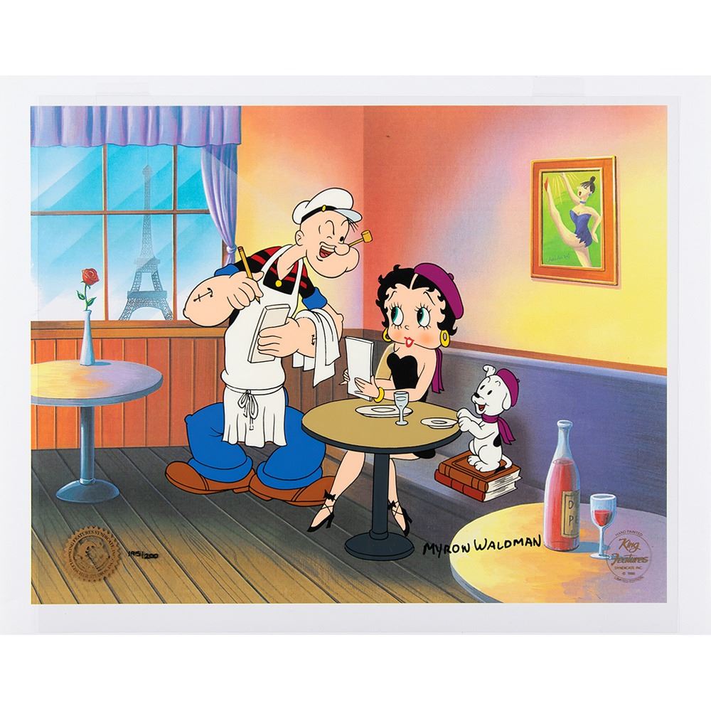 Limited edition hand-painted animation cel entitled 'Today’s Special…,' numbered 195/200, signed in black felt tip by Myron Waldman. The restaurant scene depicts Popeye as a waiter asking Betty Boop and her dog Pudgy what they would like to order for food. The total character image measures 7 x 7.25, with overall dimensions of 14 x 11. The cel, which is placed on a matching color lithograph background, bears a 1998 King Features limited edition gold stamp. In very fine condition. Accompanied by a certificate of authenticity from Toon Art, Inc.