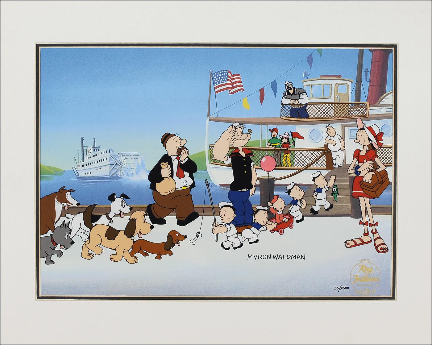 Color limited edition sericel, 16 x 11.5, entitled ‘Tallstacks,’ showing Popeye, Olive Oyl, Wimpy, and Popeye’s nephews preparing to board Bluto’s boat, signed in black felt tip by Waldman. Double matted to an overall size of 20 x 16. In very fine condition.