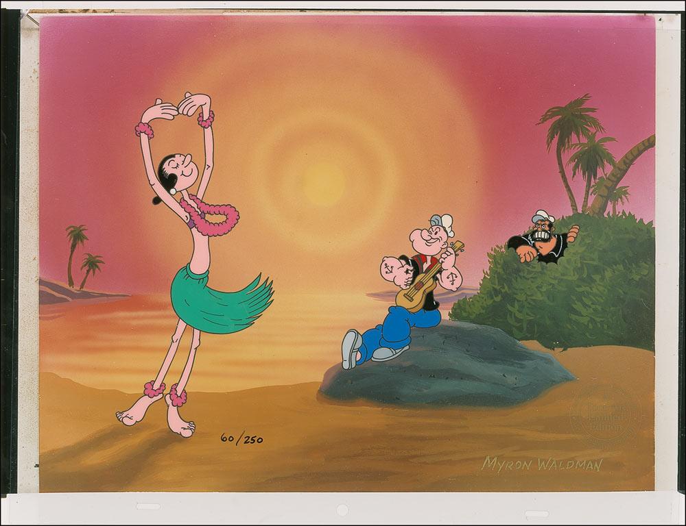 Limited edition hand-painted animation cel, #60/250, entitled, ‘Dancing on the Beach,’ 12.5 x 9, showing Olive Oyl dancing for Popeye, with an onlooking and jealous Brutus in the bushes. Signed in gold ink by Waldman, and set against a pre-printed satin-finish color background. In fine condition, with portions of cel sticking to background.