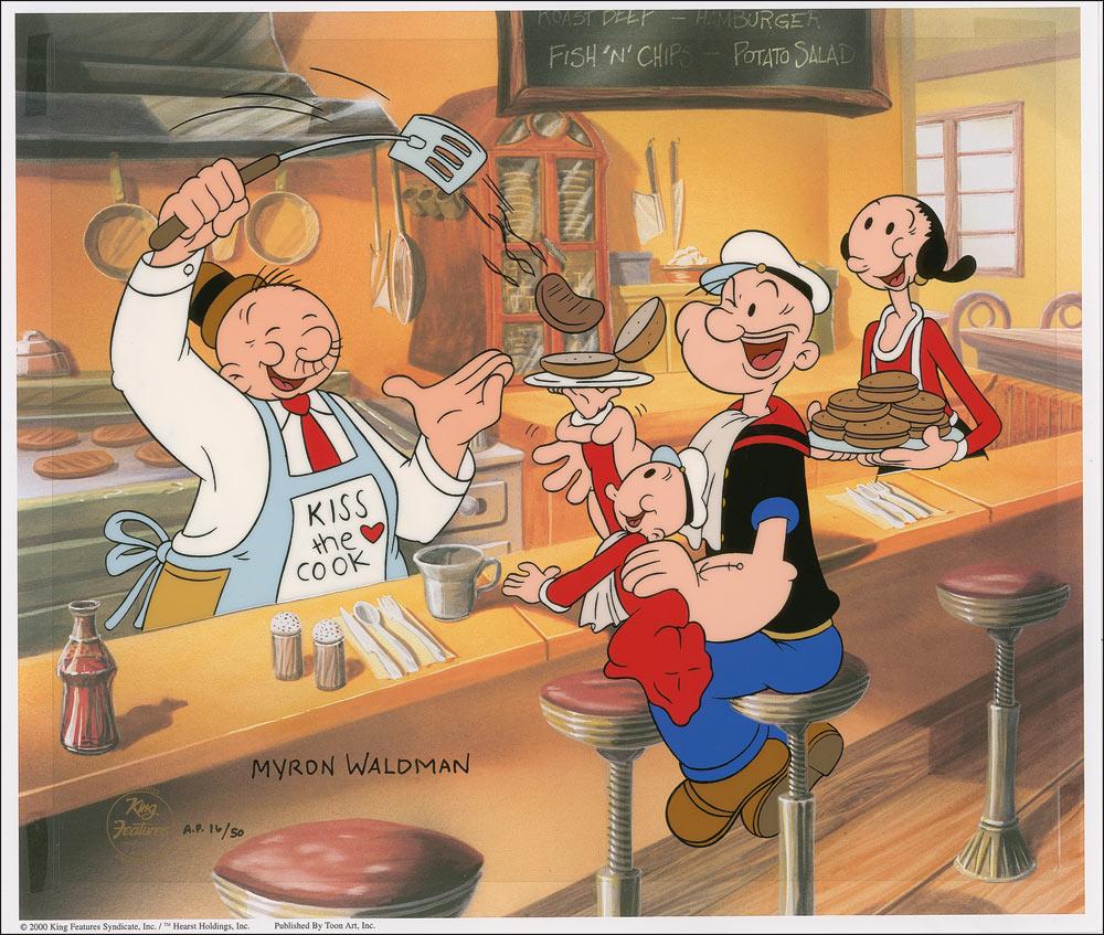 Limited edition hand-painted animation sericel, #A.P. 16/50 entitled ‘Orders Up,’ 12.5 x 10.25, showing Whimpy serving up a burger to Popeye and Swee'Pea with some help from Olive Oyl. Signed in black felt tip by Waldman, and set against a pre-printed lithographic background. In fine condition.