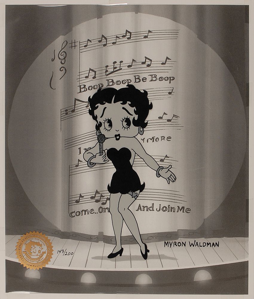Bettu on Stage - Limited edition hand-painted animation cel, numbered 144/200, 11 x 13, showing Betty Boop singing on stage, signed in black ink by Waldman, and set against a pre-printed background. In fine condition.