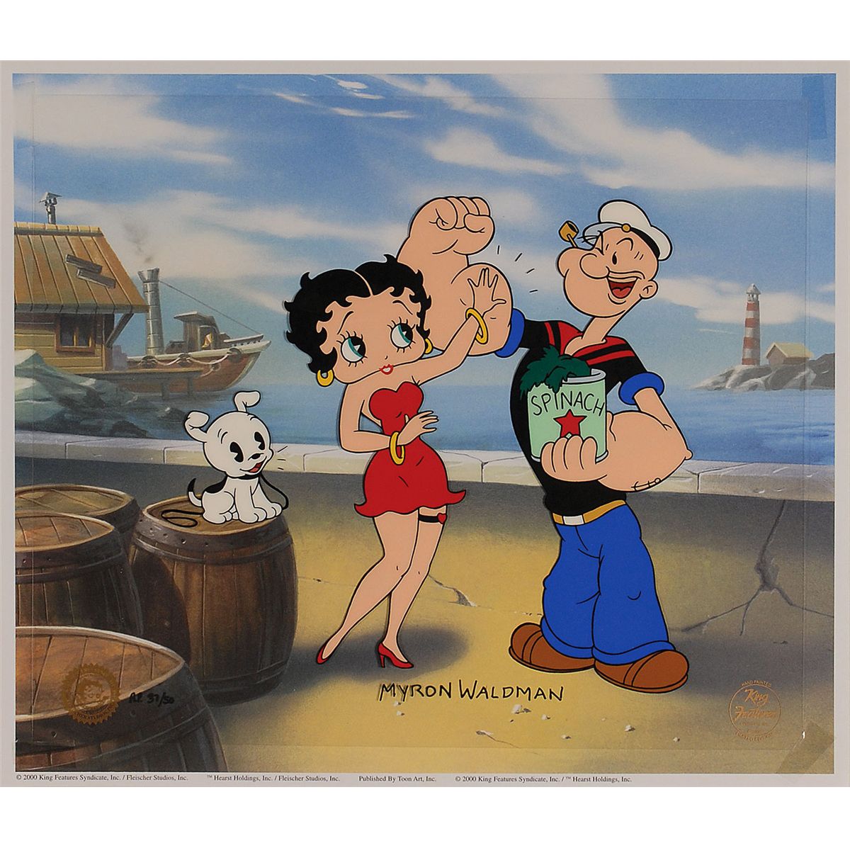 Limited edition hand-painted animation cel, entitled ‘Flexing for Betty,’ numbered AP 37/50 (from an edition of 500 plus 50 artist’s proofs), 13.75 x 11.75, showing Popeye holding a can of spinach and flexing his muscles for Betty Boop, signed in black in