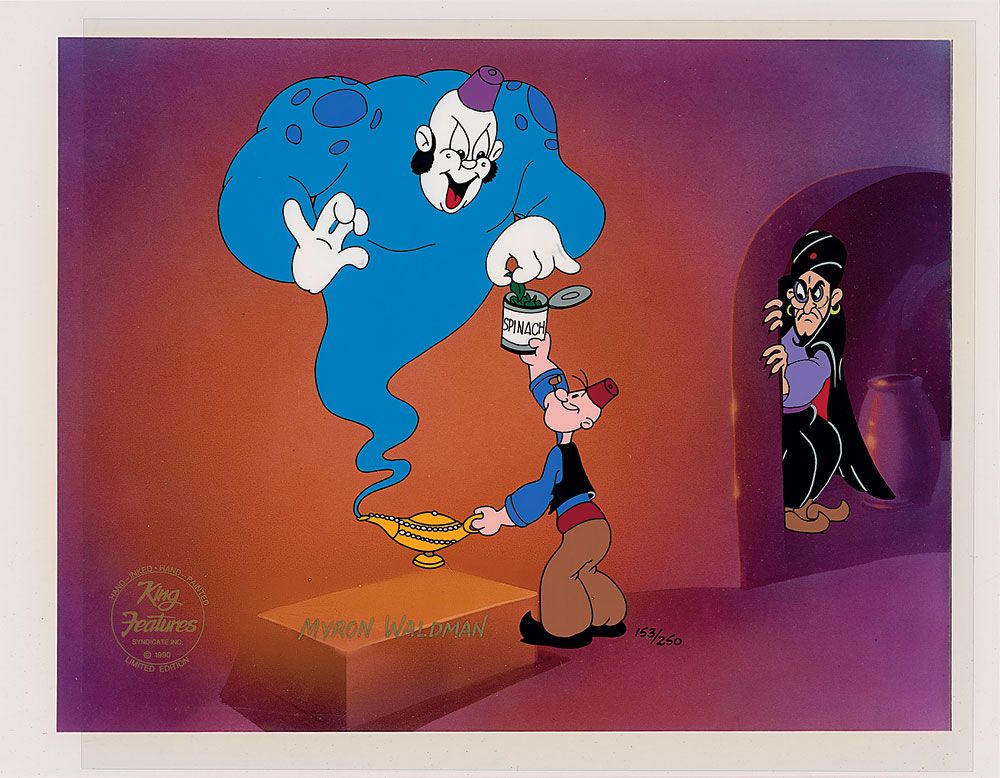 Limited edition hand-painted animation cel featuring Popeye feeding spinach to a genie, numbered 153/250, 14 x 11, signed in gold ink by Waldman, and set against a pre-printed color satin-finish background. Cel bears a 1990 King Features limited edition gold stamp. In fine condition.