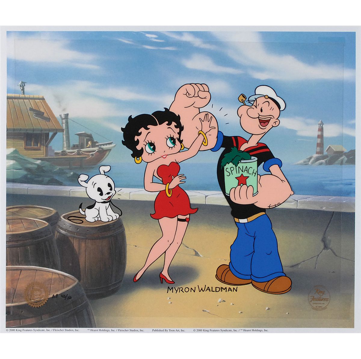 Limited edition hand-painted animation cel of Popeye entitled ‘Flexing for Betty,’ numbered AP 40/50, 12.5 x 10.25, signed in black ink by Waldman, and set against a pre-printed color cardstock background to an overall size of 13.75 x 11.75. Cel bears a 2000 King Features limited edition gold stamp. In fine condition.