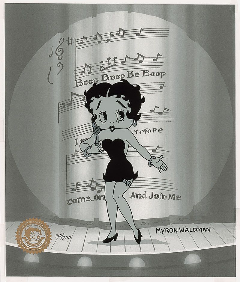 Limited edition hand-painted animation cel of Betty Boop performing entitled ‘Betty on Stage,’ numbered 140/200, 10.5 x 12.5, signed in black ink by Waldman, and set against a pre-printed background to an overall size of 11 x 13. Cel bears a 1999 King Features limited edition gold stamp. In fine condition.
