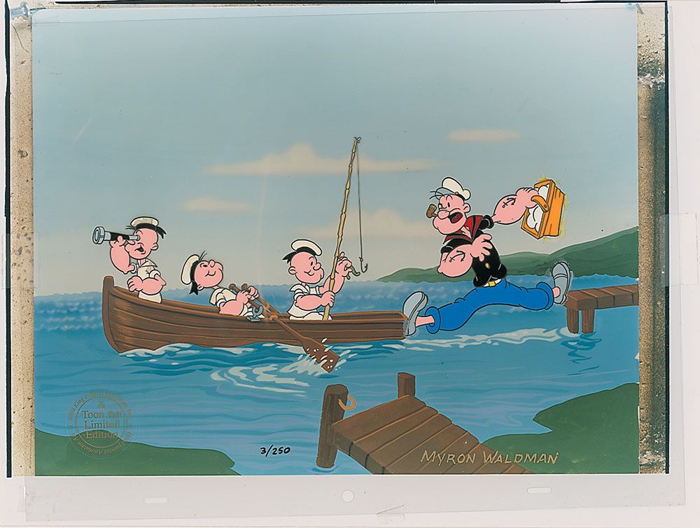Limited edition hand-painted animation cel of Popeye fishing, entitled ‘Gone Fishing,’ numbered 3/250, 13.5 x 10.25, signed in gold ink by Waldman, and set against a pre-printed color satin-finish background to an overall size of 14.5 x 11. Cel bears a 1990 King Features limited edition gold stamp. In fine condition.