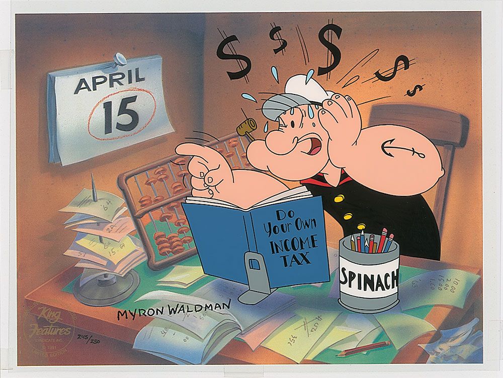 Limited edition hand-painted animation cel of Popeye struggling with his taxes, entitled ‘Who Does Your Taxes?,’ numbered 245/250, 12.5 x 9.5, signed in black ink by Waldman, and set against a pre-printed color satin-finish background to an overall size of 13 x 9.75. Cel bears a 1991 King Features limited edition gold stamp. In fine condition.