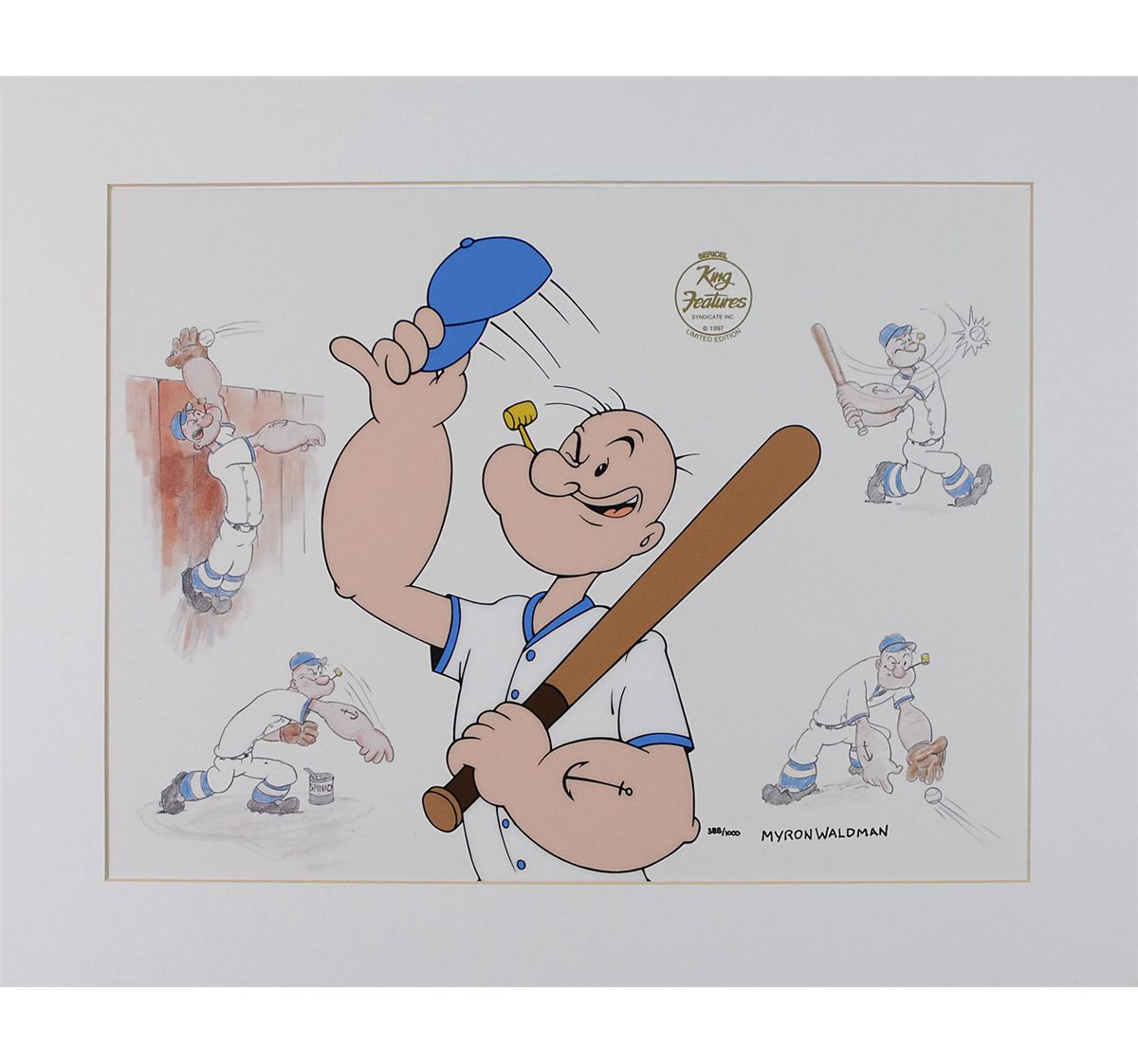 Limited edition sericel of Popeye in a baseball uniform, entitled ‘Take Him Out to the Ball Game,’ numbered 388/1000, 16 x 12, signed in black ink by Waldman, and set against a pre-printed color background of Popeye in various baseball poses. Cel bears a 1997 King Features limited edition gold stamp. Matted to an overall size of 20 x 16. In fine condition.