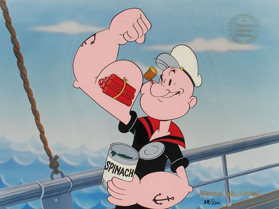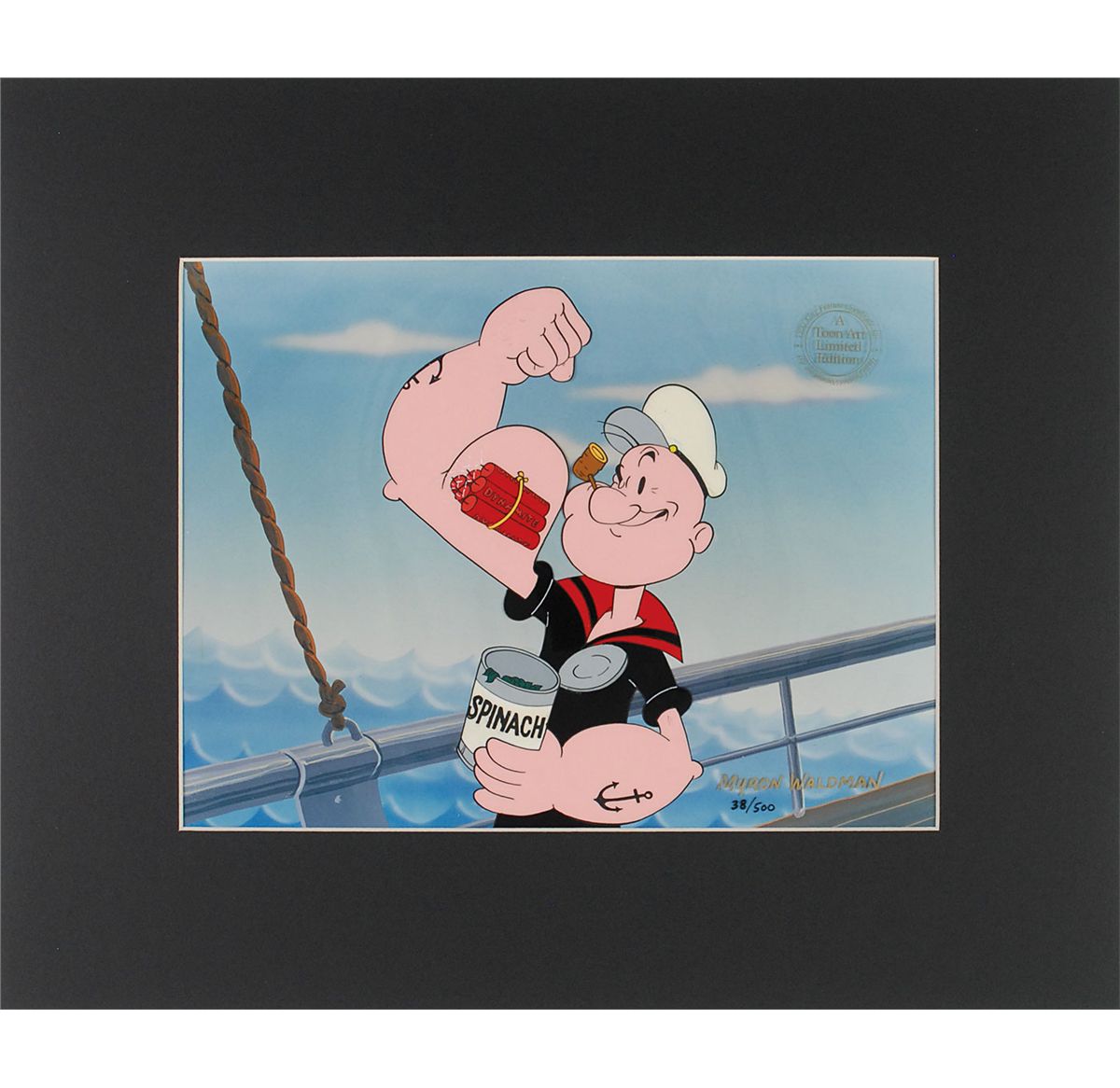 Limited edition hand-painted animation cel, 12 x 9, 38/500, depicting Popeye flexing his dynamite-laden bicep. Signed in gold ink by Waldman and set against a pre-printed background. Matted to an overall size of 18 x 15. In fine condition, with some slight rippling.