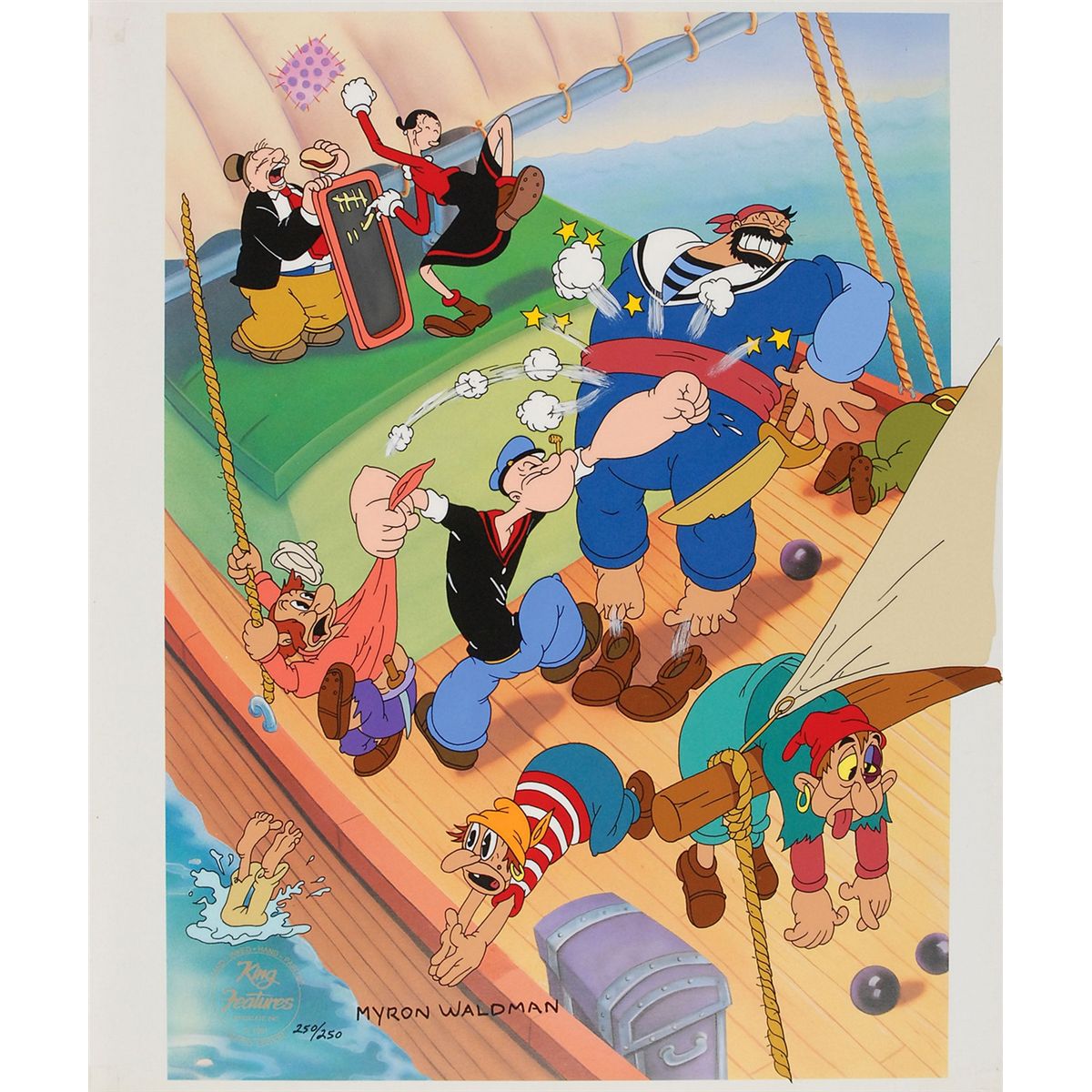 Limited edition hand-painted animation cel entitled ‘Mutiny,’ numbered 250/250, 13.5 x 16.25, depicting Popeye in a violent scene at sea. Signed in black ink by Waldman and set against a pre-printed background. Cel bears a 1991 King Features limited edition gold stamp. In fine condition.