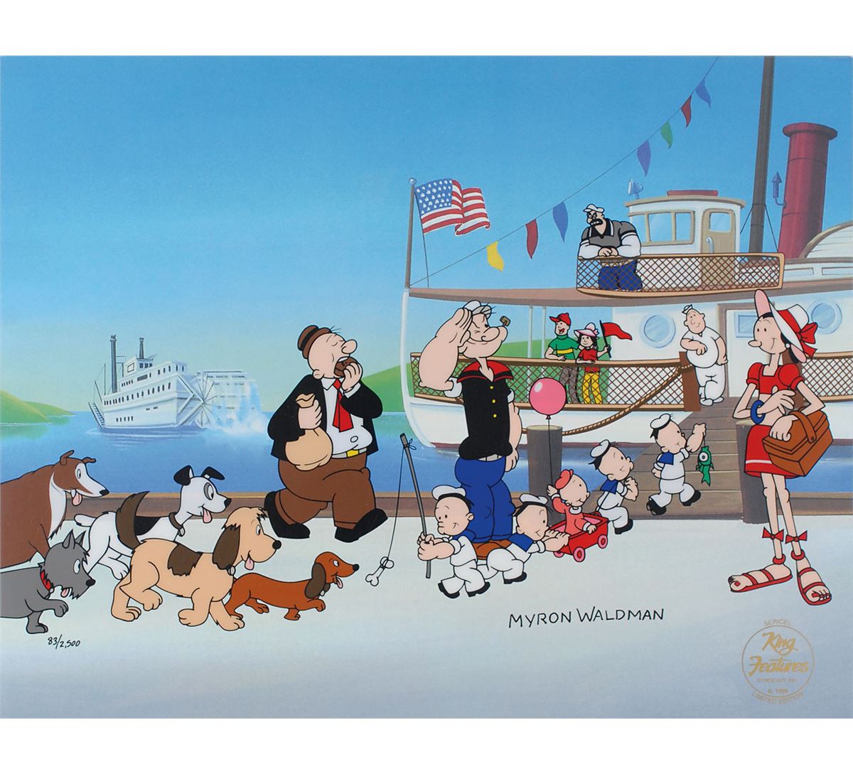 Limited edition sericel entitled ‘Tallstacks,’ numbered 83/2500, 16.75 x 13, depicting Popeye, Olive Oyl, and their nephews boarding a ship. Signed in black ink by Waldman and set against a pre-printed background. Cel bears a 1999 King Features limited edition gold stamp. In fine condition.