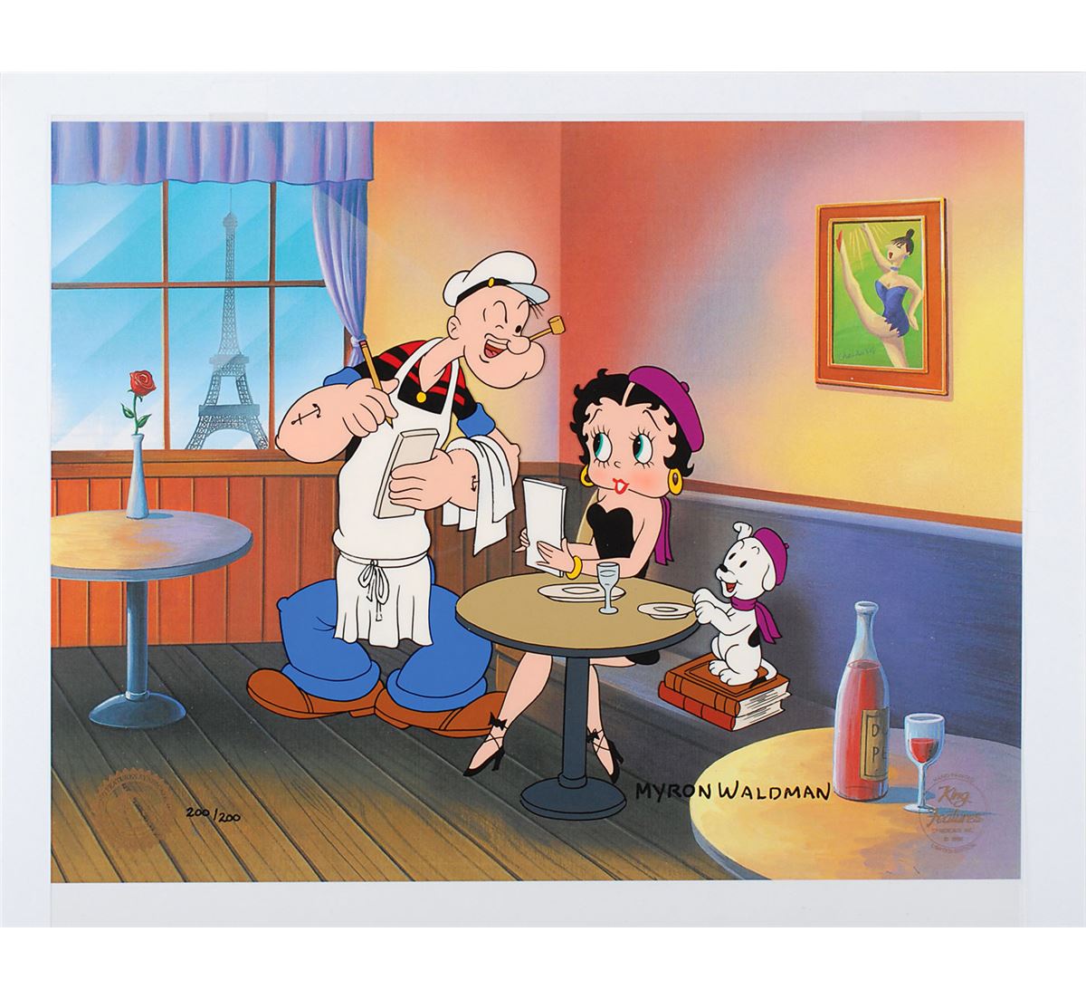 Limited edition hand-painted animation cel entitled ‘Today’s Special,’ numbered 200/200, 14 x 11, depicting Popeye waiting on Betty Boop in a restaurant. Signed in black ink by Waldman and set against a pre-printed background. Cel bears a 1998 King Features limited edition gold stamp. In fine condition.