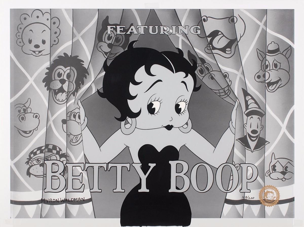Limited edition hand-painted animation cel entitled ‘Curtain Call,’ numbered 148/200, 19 x 14, depicting Betty Boop coming out from behind a theatre curtain. Signed in black ink by Waldman and set against a pre-printed background. Cel bears a King Features limited edition gold stamp. In fine condition.