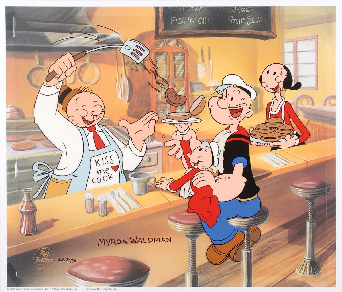 Limited edition hand-painted animation cel entitled ‘Orders Up,’ numbered AP 24/50, 13.75 x 11.75, depicting Popeye and family sitting down for a meal at a classic diner. Signed in black ink by Waldman and set against a pre-printed background. Cel bears a 2000 King Features limited edition gold stamp. In fine condition.