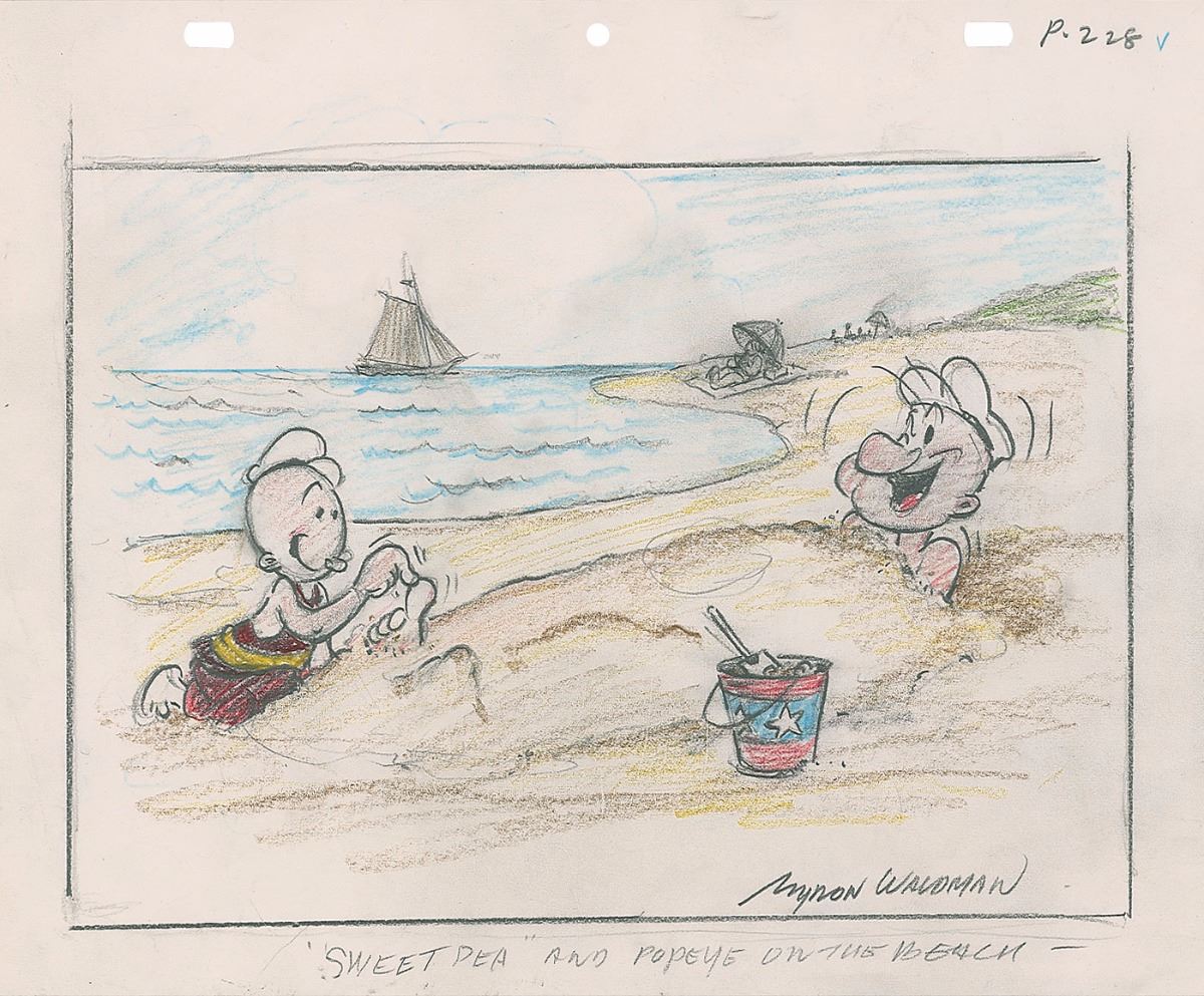 Detailed graphite and colored pencil sketch entitled “‘Sweet Pea’ and Popeye on the Beach,” accomplished by Waldman on a 12.5 x 10.25 sheet of illustration paper and signed along the bottom in pencil. In fine condition.