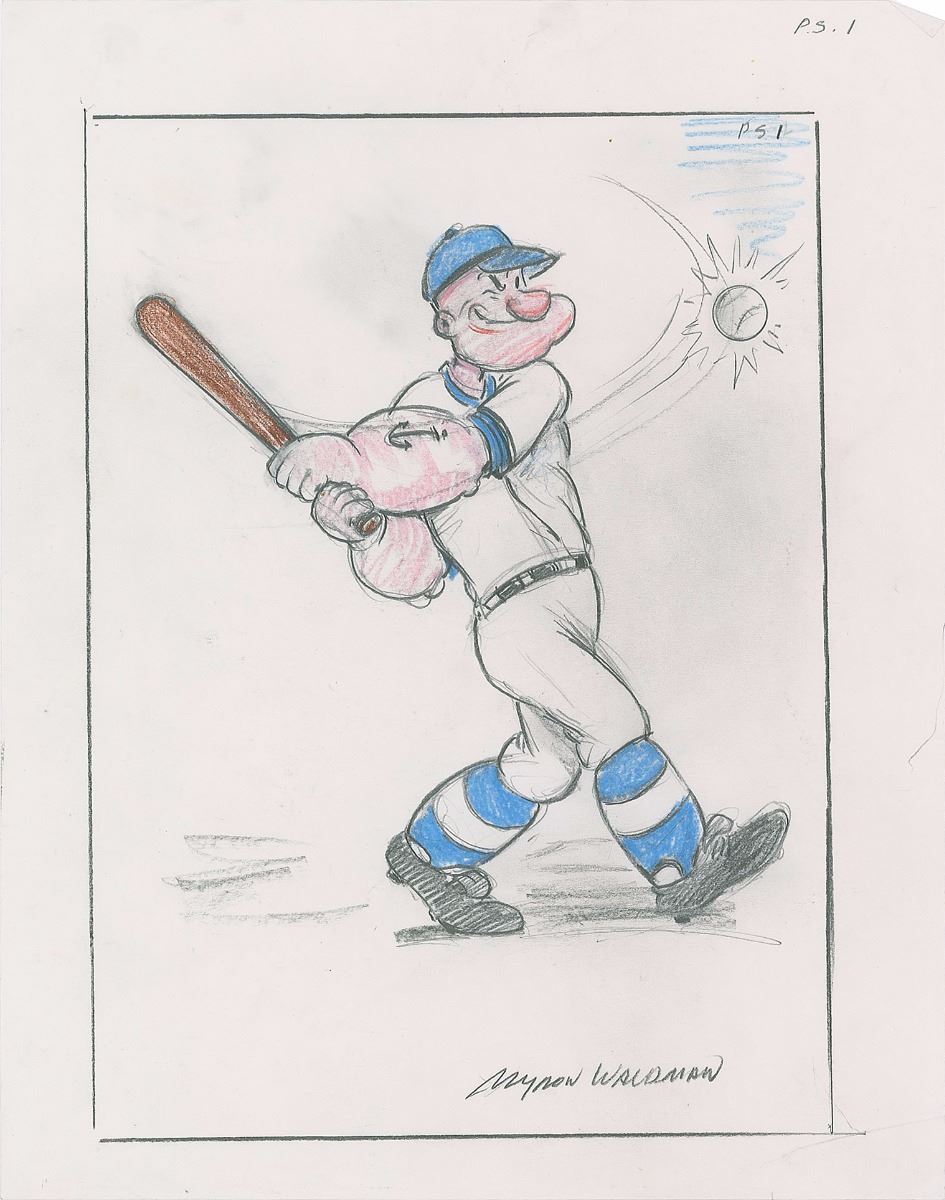 Original graphite and colored pencil sketch entitled ‘Popeye Takes a Swing,’ showing the large-armed sailor in a baseball uniform moments after connecting on a pitch, accomplished by Waldman on an off-white 11 x 14 sheet, signed along the bottom in pencil. In fine condition.
