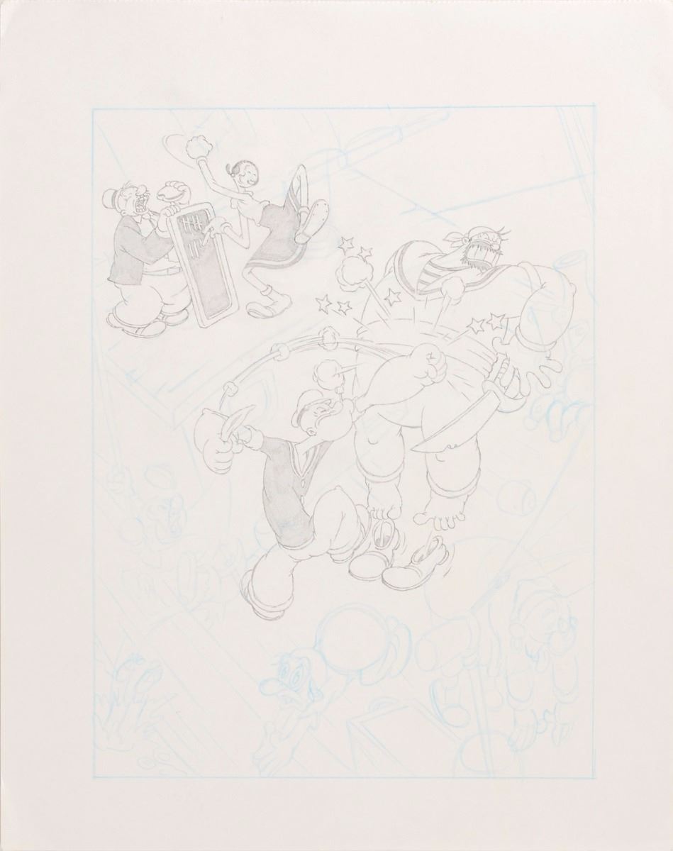 Limited edition original hand-painted animation cel entitled ‘Mutiny,’ 11 x 15, numbered 206/250, showing Popeye fighting off Bluto and a cast of pirates as Wimpy and Olive Oyl keep a scoreboard of the melee. Signed in black ink by Waldman and set against a matching color copy background. Cel bears a 1991 King Features limited edition gold stamp. Double-mated and in fine condition. Accompanied by the original master drawing for ‘Mutiny,’ 11 x 14, accomplished in graphite and colored pencil by Waldman, as well as a King Features certificate of authenticity.