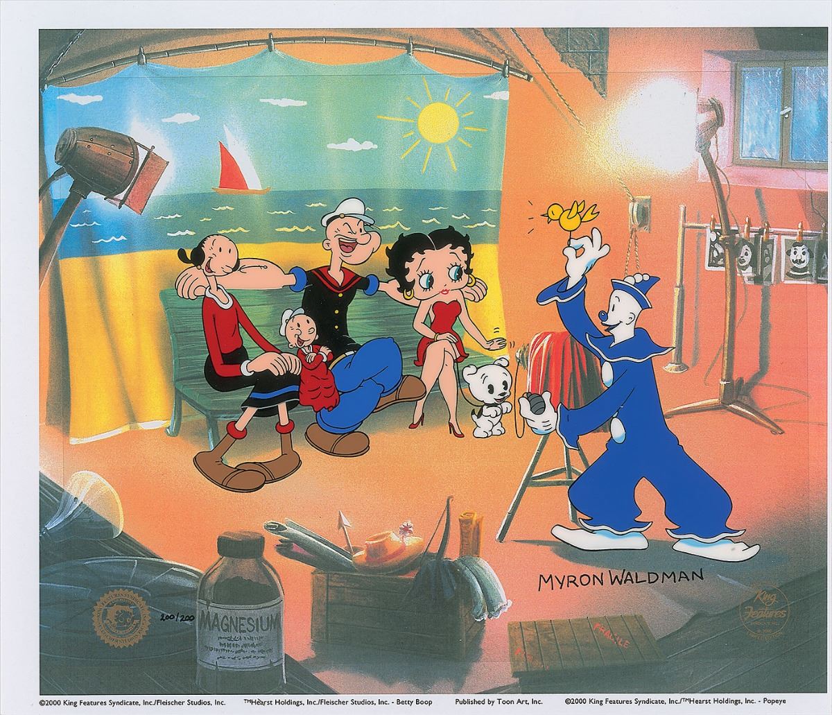 Limited edition original hand-painted animation cel entitled ‘Photo Op,’ 12.5 x 9.75, numbered 200/200, showing Koko the Clown preparing to take a photo of Popeye, Olive Oyl, Swee’ Pea, Betty Boop, and her dog Pudgy, against a sunny beach backdrop. Signed in black ink by Waldman and set against a pre-printed background. Cel bears a 2000 King Features limited edition gold stamp and a Fleischer Studio gold stamp. In fine condition.