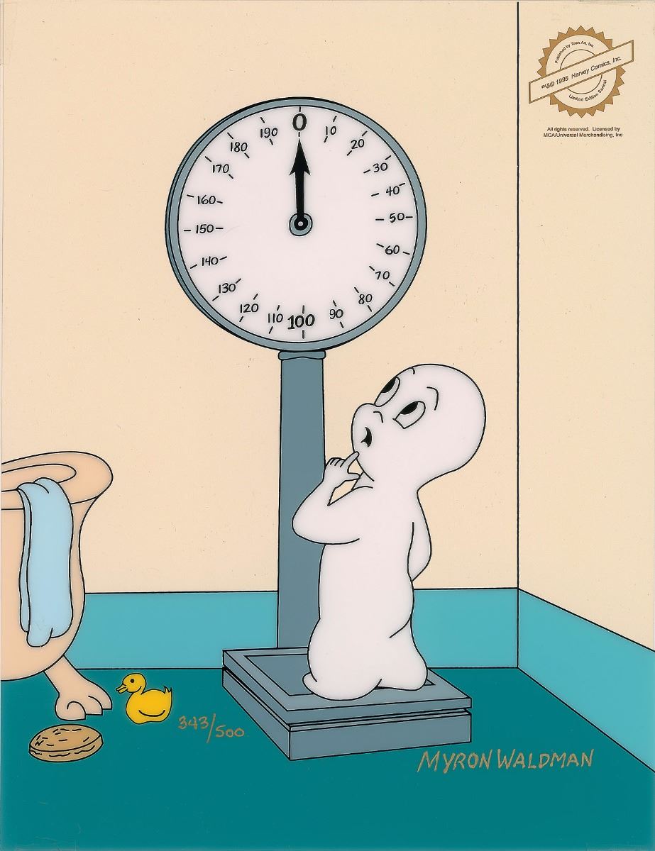 Limited edition sericel entitled 'Lightweight' depicting Casper the Friendly Ghost on a scale, numbered 343/500, 10.75 x 17, signed in gold ink in the lower right by Waldman. Upper right bears a 1995 Harvey Comics seal. In fine condition. Pre-certified PSA/DNA.