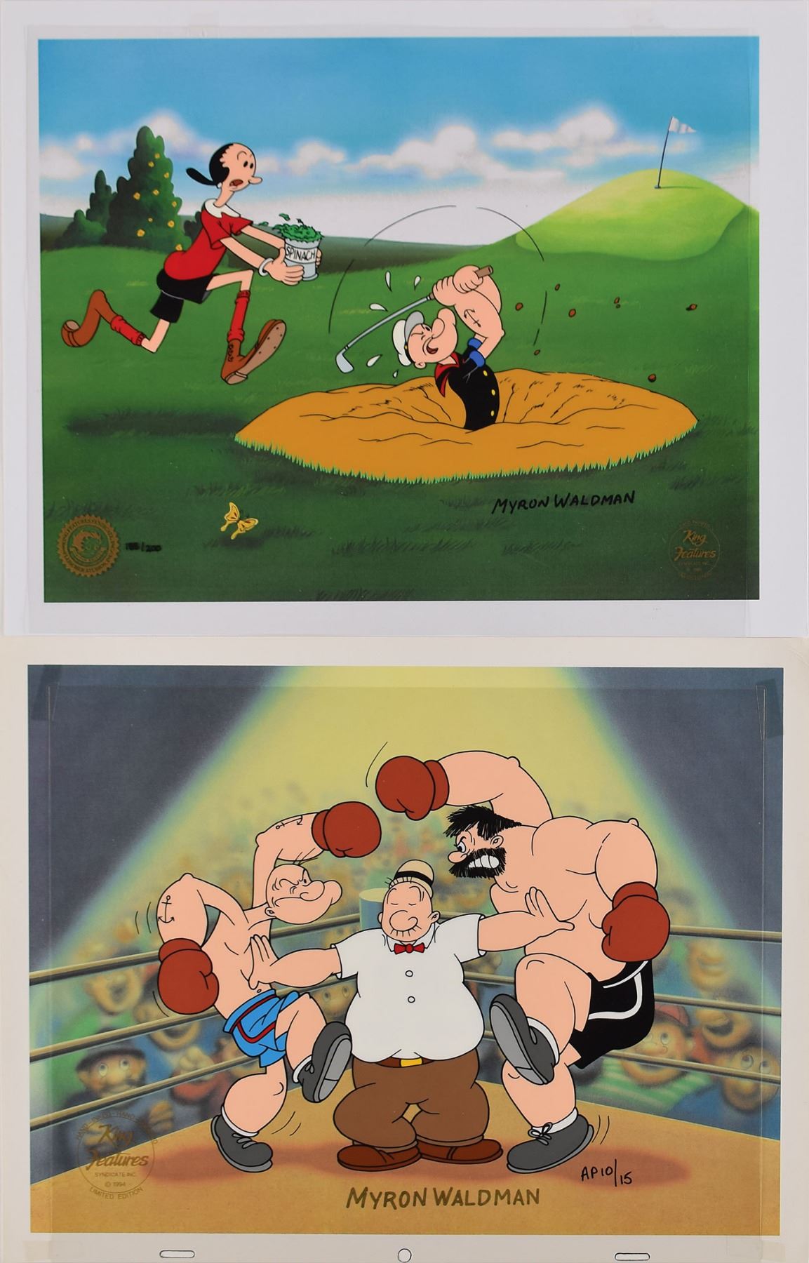 Two limited edition hand-painted animation cels signed by Waldman: one artist's proof entitled 'Let's Rumble,' numbered AP 10/15, showing Popeye and Brutus squaring off in a boxing match with Wimpy officiating, signed in gold ink by Myron Waldman; and one hand-painted cel entitled 'A Day at the Links', numbered 188/200, showing Popeye and Olive Oyl golfing together, signed in black ink by Myron Waldman. In overall fine condition. Accompanied by certificates of authenticity from Toon Art, Inc., for both.