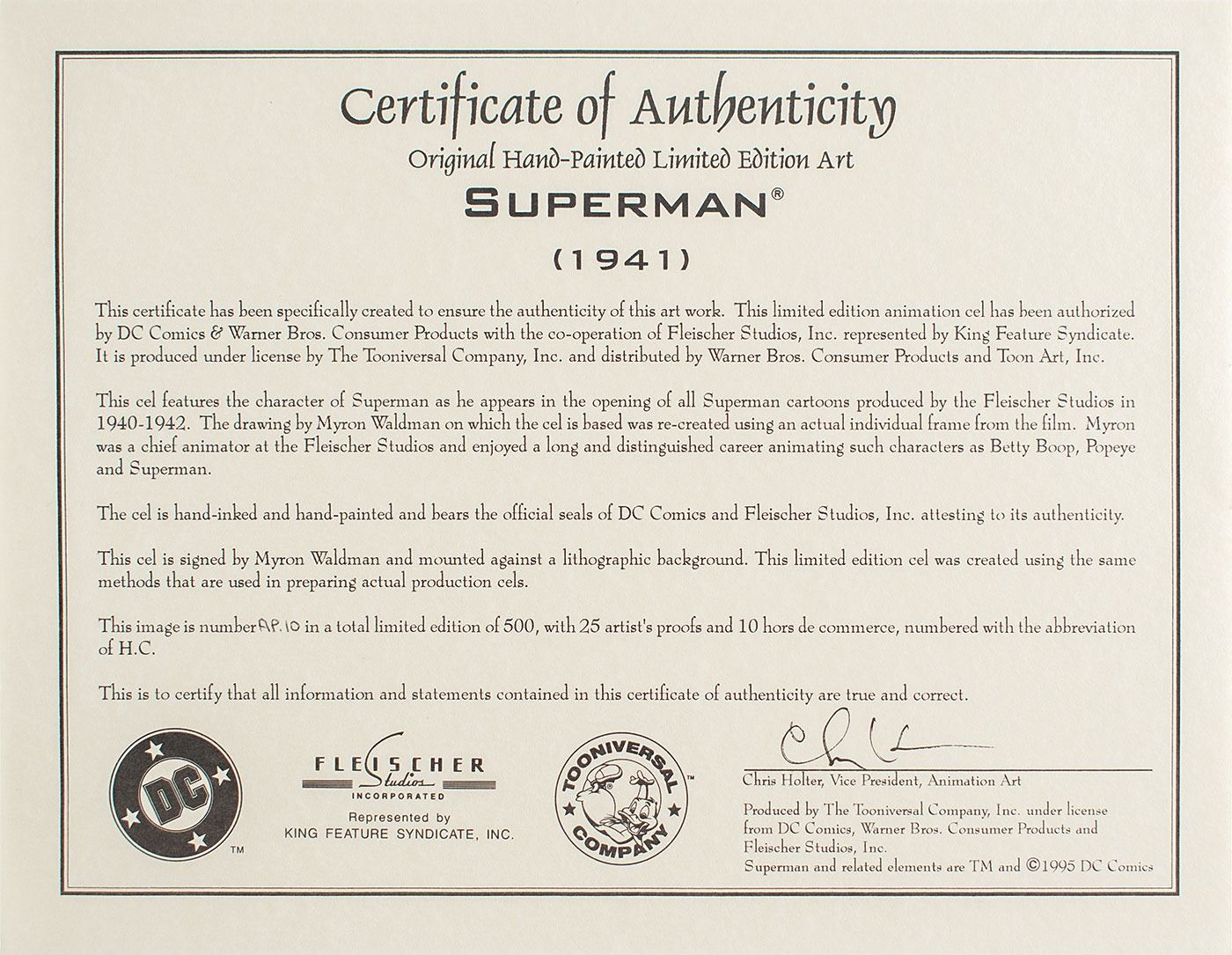 Limited edition hand-painted artist's proof animation cel entitled 'Superman,' numbered AP 10/25, signed in the lower right corner in gold ink by Myron Waldman. Includes the original master drawing accomplished in graphite and colored pencil, signed in the lower right corner in pencil by Myron Waldman. Overall dimensions are 14.75 x 18.25. In fine condition. Accompanied by a printed title card.