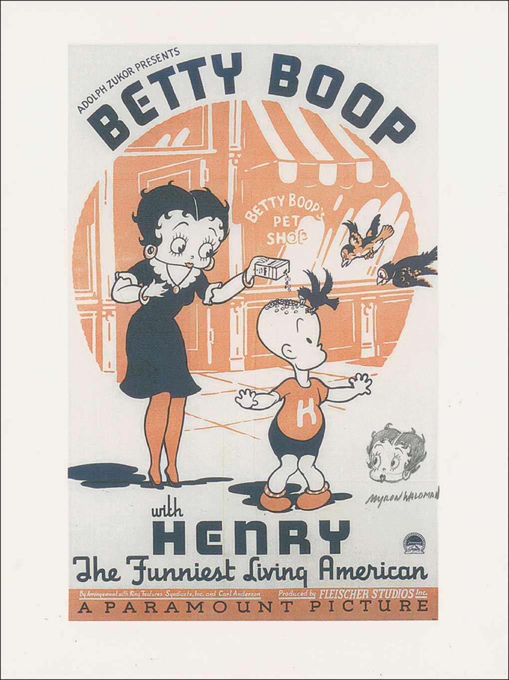 Color 9 x 12 print of a poster for a Bettie Boop and Henry cartoon, signed in pencil by Waldman. In very fine condition.